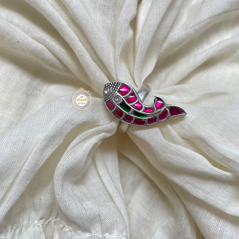 Inspired by one of the most beautiful creations on the Earth, this silver ring is designed to replicate the beauty of fish by intricately embedding colorful stones to add charm to its best. SIZE : ADJUSTABLE