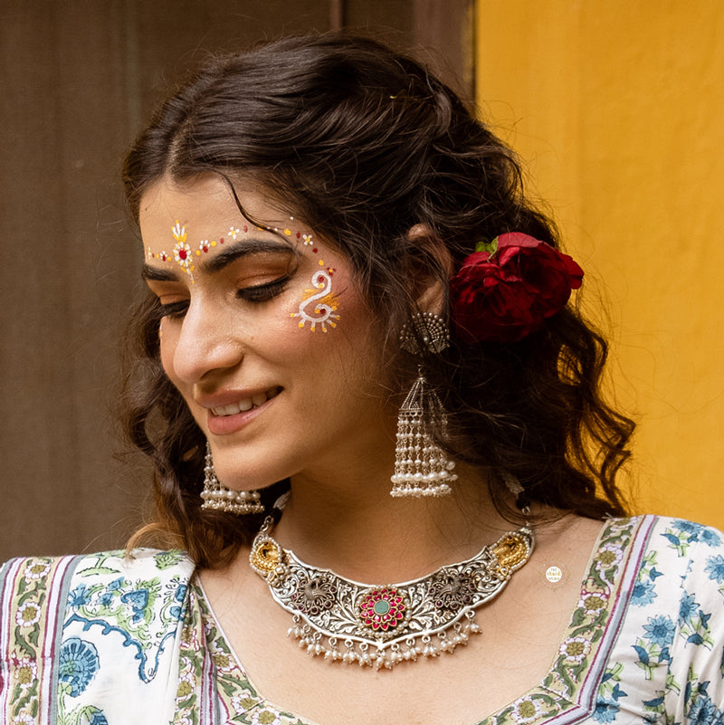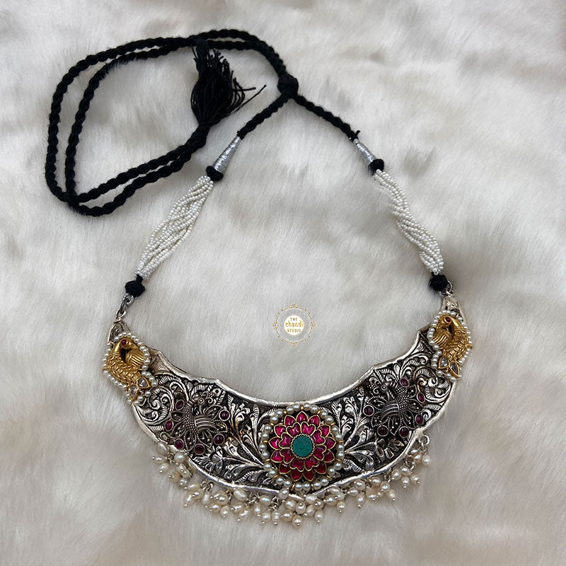 Muhurat Chitai Kundan Necklace The right Muhūrta comes when the zodiacs come into play at the right time, with the right light and radiance. This piece of magnificent beauty is all about regal vibes, trad look, modern motifs, and elegant design. Pair this silver beauty with intricate patterns and pearl danglers that beautifully adorns your neckline with your favorite saree, and a bright smile.   Material – Sterling Silver 92.5%