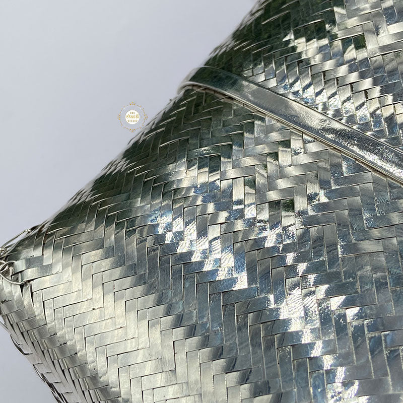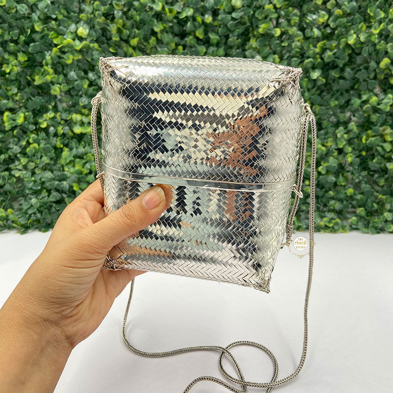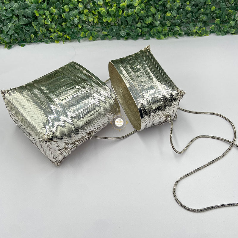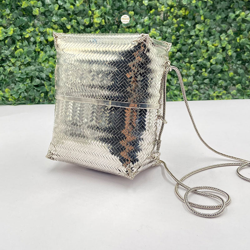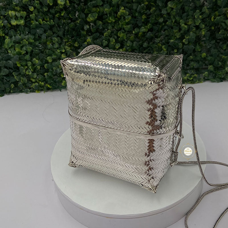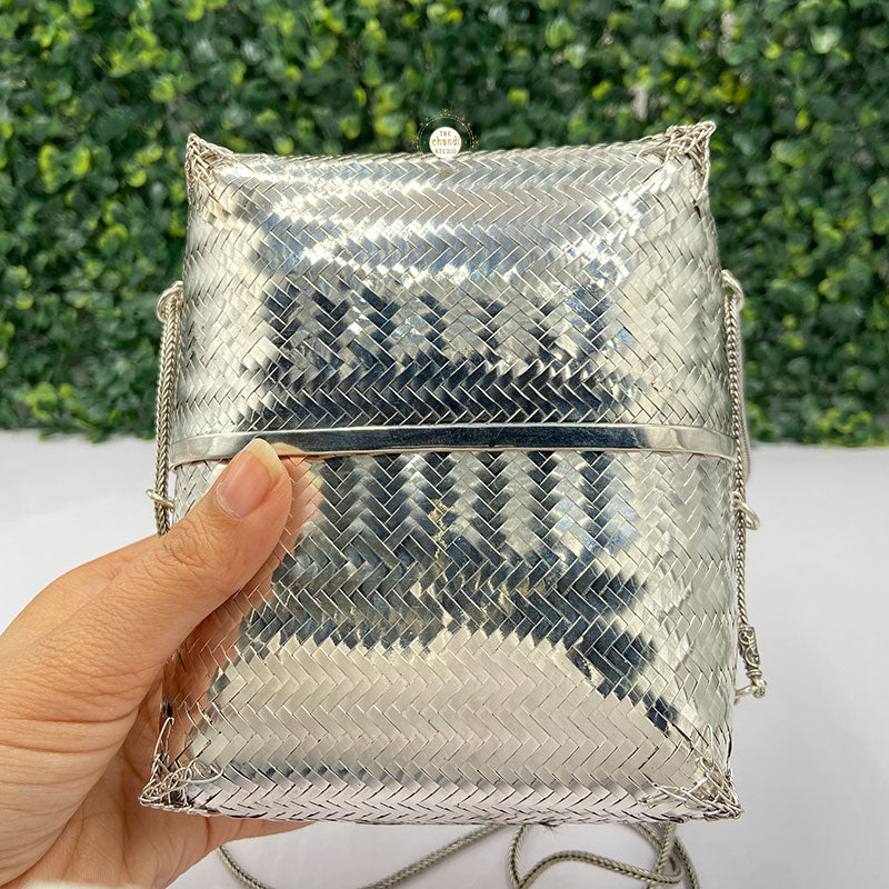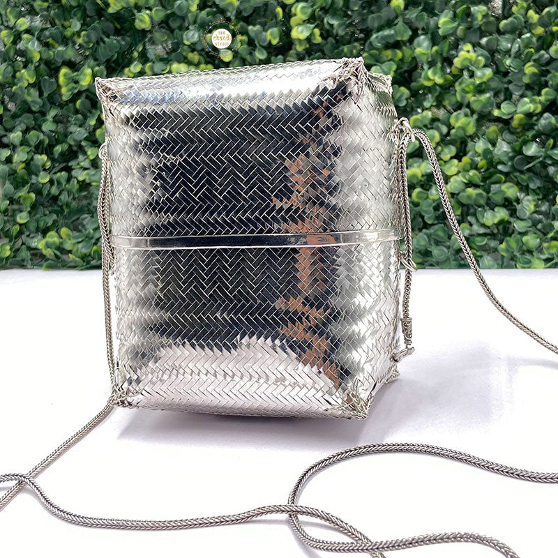 Elevate your style with the Maharani Chatai Box Purse, a handcrafted masterpiece. Featuring intricate chatai-inspired detailing, this purse blends royal charm with modern utility, perfect for weddings and festive occasions.