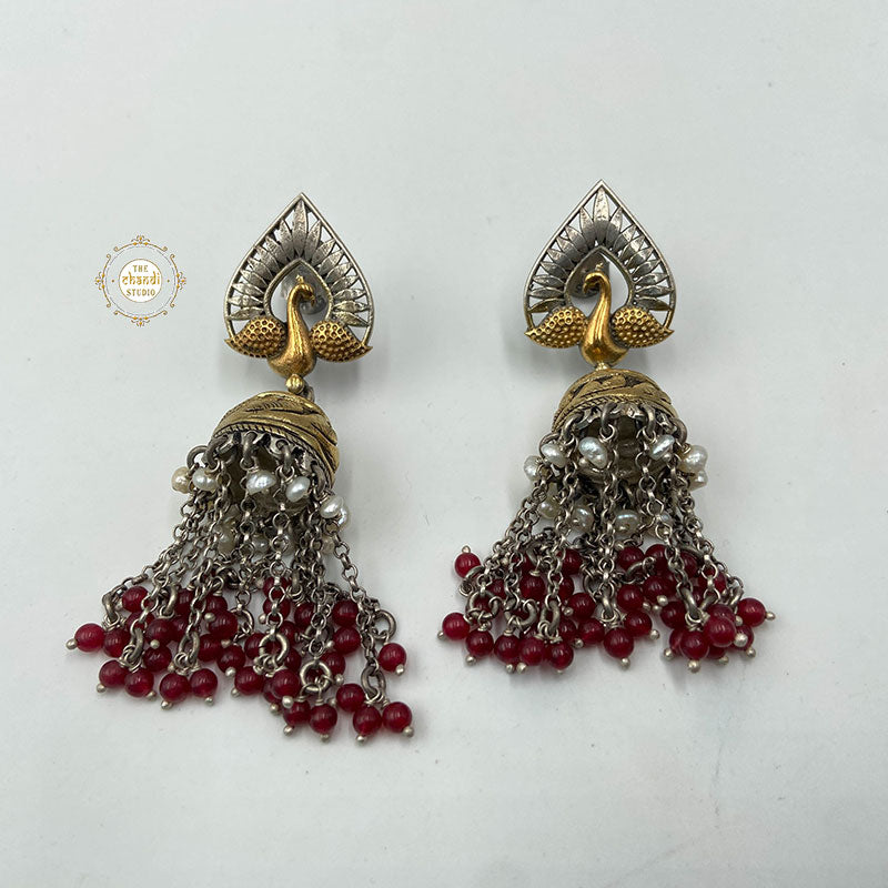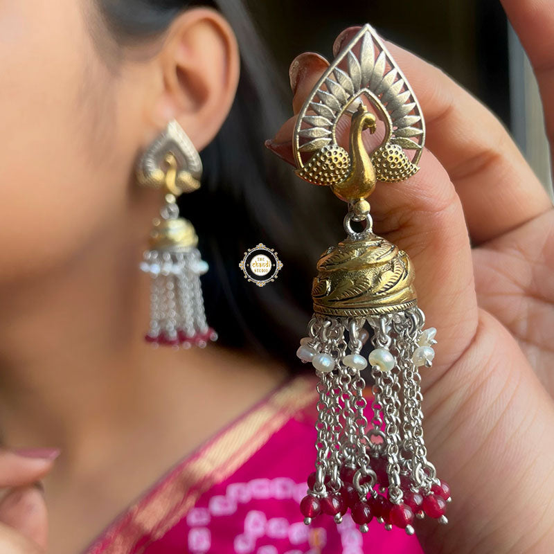 Majestic Peacock Chitai Jhumki Dual Tone   The peacock are symbolic of re-growth and rejuvenation. Pearls are associated with purity, love, and innocence. We are sure our Majestic Peacock Chitai Jhumki is one such statement piece that you can style on repeatedly & step above the rest. With Chitai work & freshwater pearls, it is festive, unique & simply gorgeous! MATERIAL : STERLING SILVER 92.5