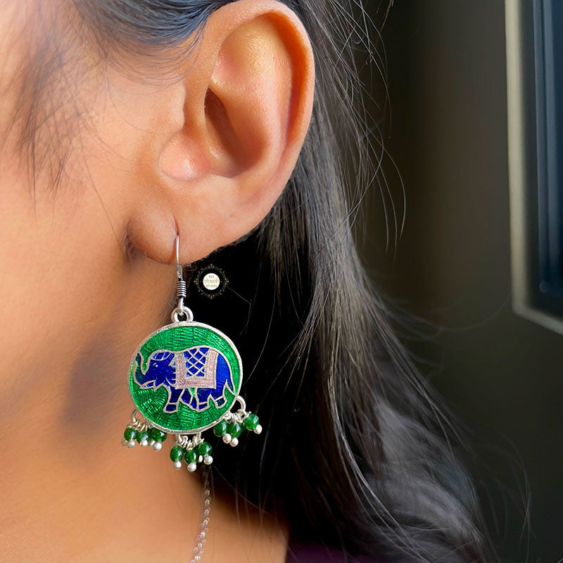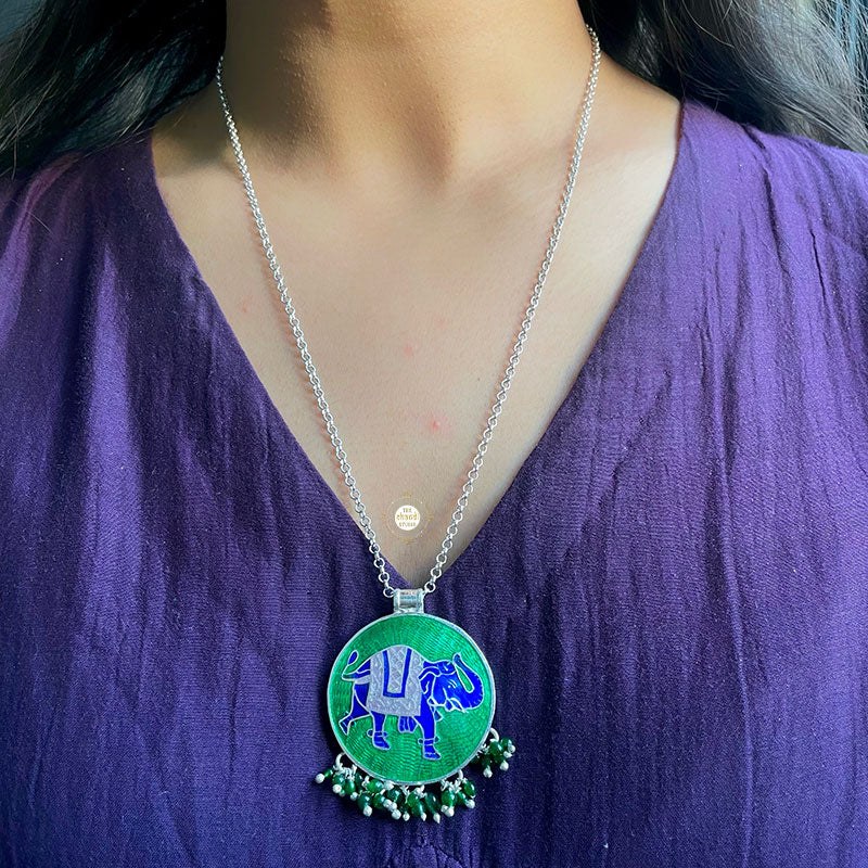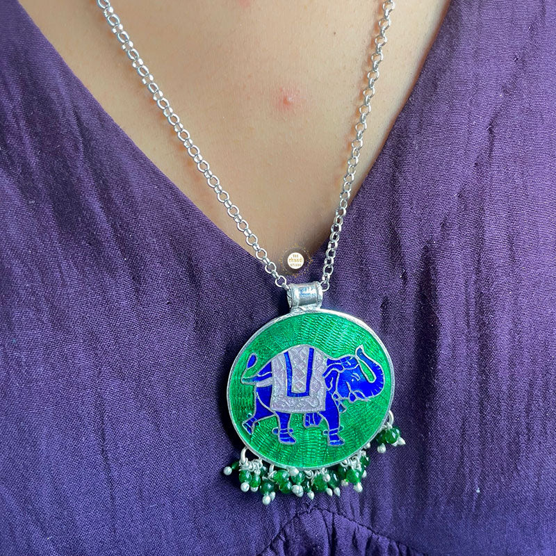 Adorn yourself with the exquisite charm of our Meenakari Elephant Bead Necklace Set. Handcrafted with precision and adorned with vibrant beads, this set exudes elegance and tradition. The intricately designed elephant pendant adds a touch of cultural richness to your ensemble, making it a perfect blend of style and tradition. Elevate your look with this beautifully crafted necklace set that effortlessly captures attention and adds a touch of ethnic allure to any outfit. MATERIAL : STERLING SILVER 92.5