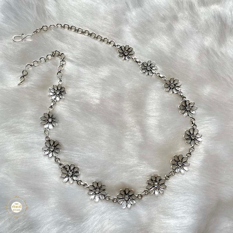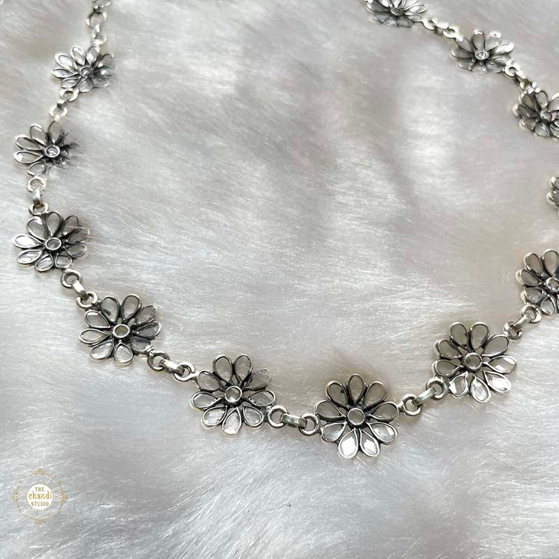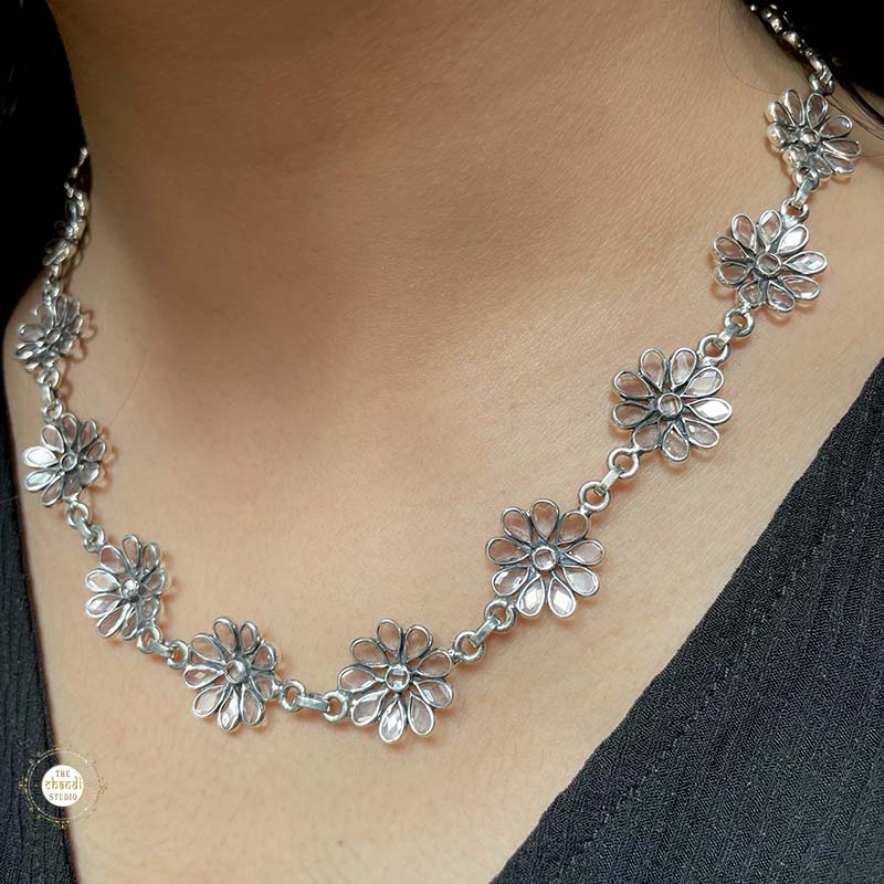 The minimal flower necklace exudes refined elegance with delicate floral accents. Crafted from 92.5 sterling silver, it features intricately designed blossoms, offering a subtle yet sophisticated addition to any ensemble.
