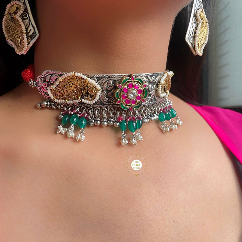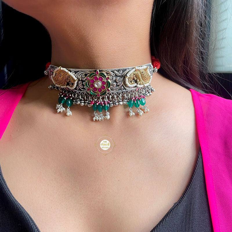 The right Muhūrta comes when the zodiacs come into play at the right time, with the right light and radiance. This piece of magnificent beauty is all about regal vibes, trad look, modern motifs, and elegant design. Pair this silver beauty with intricate patterns and pearl danglers that beautifully adorns your neckline with your favorite saree, and a bright smile. Material – Sterling Silver 92.5%
