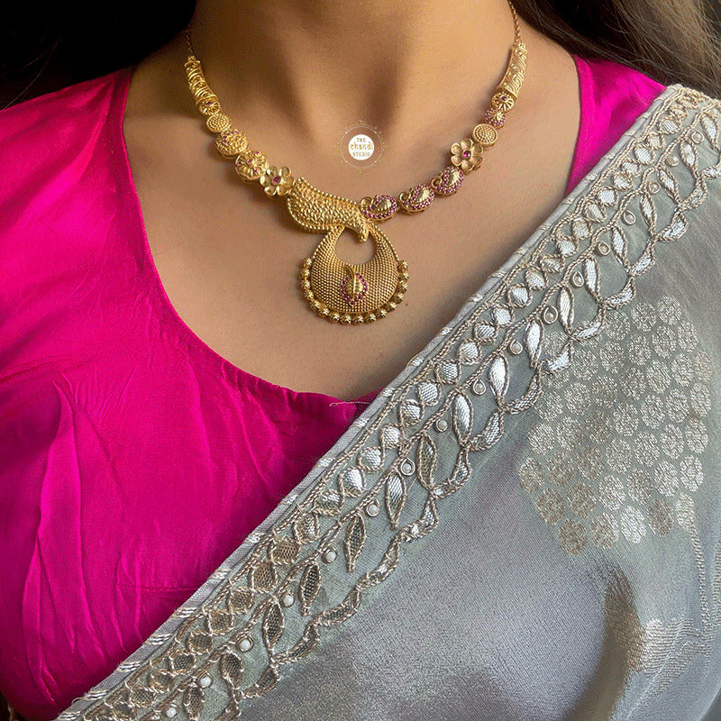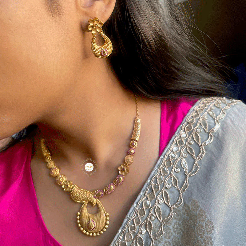The "Muhurat Full Gold Mubarak Necklace Set" combines traditional elegance with a touch of celebratory charm, making it ideal for grand occasions.