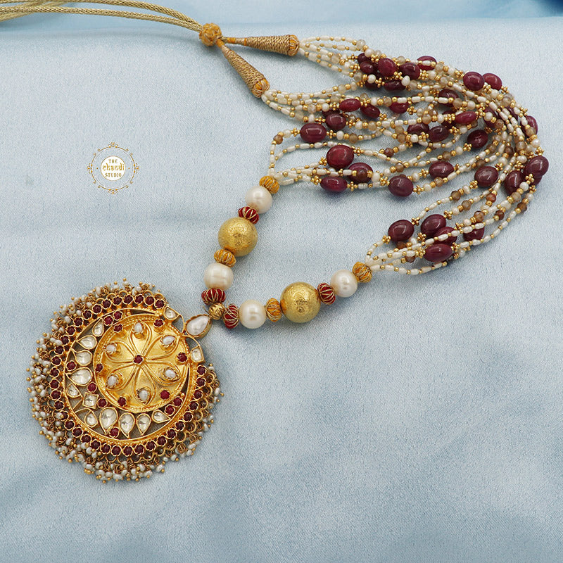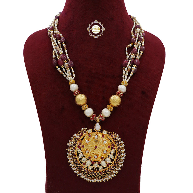 The heavy built of this Muhurat Gold Polish Chaand Necklace makes it ideal for being styled with solid bright colored tops and dresses. They can pep up your evening look especially if you wish to channel out a boho avatar with a traditional look. The full-moon shaped tassel is beautifully hanging at the end of a beaded neck chain that shows the grace of your neckline. MATERIAL : STERLING SILVER 92.5