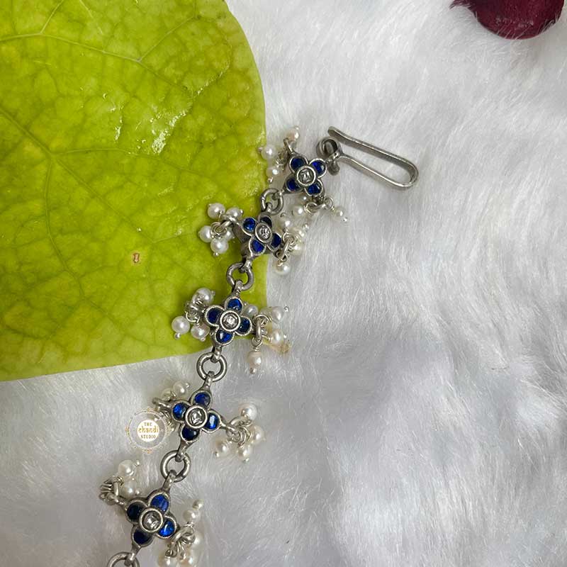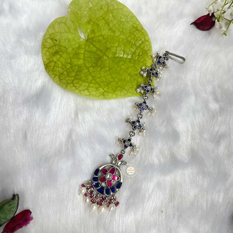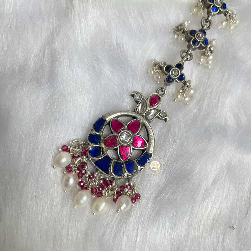 In the world of pair of earrings and pair of bangles, be the confident Maangtika, who loves herself and can face the battles alone. The Maangtika gives the bride power, will and wisdom to handle her new journey in life. This Maangtika is the key element to any great ethnic look. This tika is bound to elevate your traditional and Indo-western outfits. LENGTH : 7 inches WIDTH :  1 inch MATERIAL : STERLING SILVER 92.5