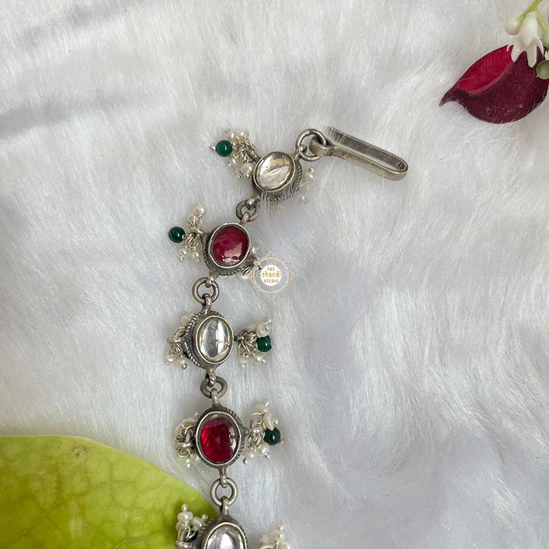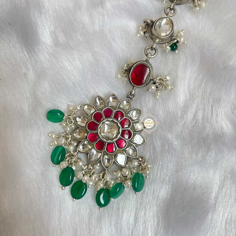 In the world of pair of earrings and pair of bangles, be the confident Maangtika, who loves herself and can face the battles alone. The Maangtika gives the bride power, will and wisdom to handle her new journey in life. This Maangtika is the key element to any great ethnic look. This tika is bound to elevate your traditional and Indo-western outfits. LENGTH : 7.5 inches WIDTH :  1.25 inch MATERIAL : STERLING SILVER 92.5