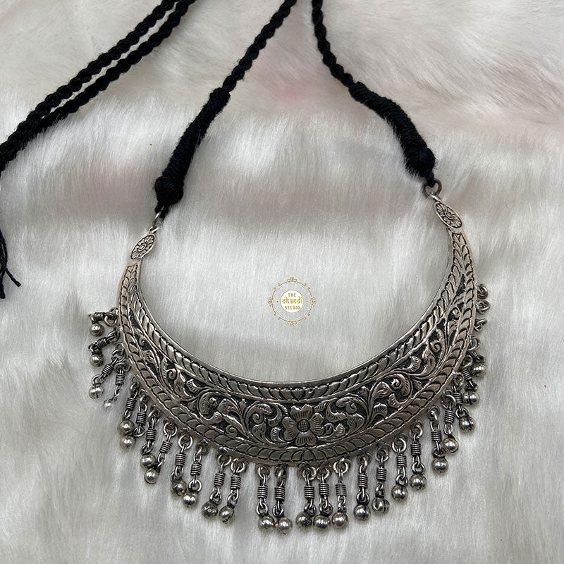 This necklace represents a crescent shaped moon tracing its root back to the Mughal Empire. The floral motifs carved on the metal moon takes you to the royal state of Rajasthan. Timeless and elegant, Nazaakat Chitai Chaand Thread Necklace can be teamed up with absolutely anything from a lehenga or sharara to an anarkali or saree. The ghungroo danglers are an added piece of classic handcraft. *Finished with an adjustable cotton thread. MATERIAL : STERLING SILVER 92.5