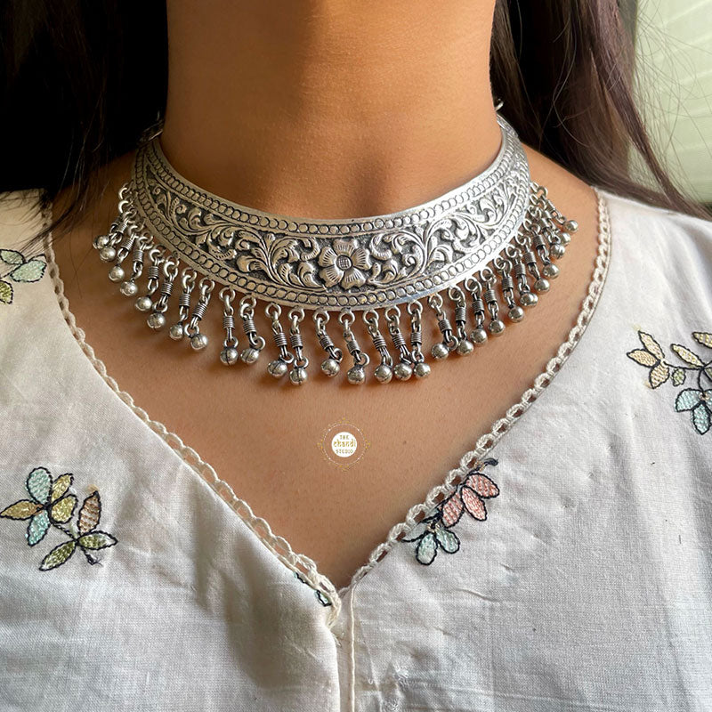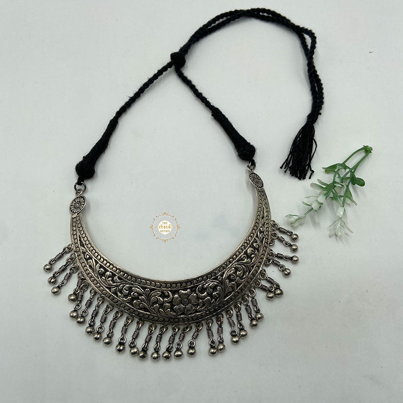 This necklace represents a crescent shaped moon tracing its root back to the Mughal Empire. The floral motifs carved on the metal moon takes you to the royal state of Rajasthan. Timeless and elegant, Nazaakat Chitai Chaand Thread Necklace can be teamed up with absolutely anything from a lehenga or sharara to an anarkali or saree. The ghungroo danglers are an added piece of classic handcraft. *Finished with an adjustable cotton thread. MATERIAL : STERLING SILVER 92.5