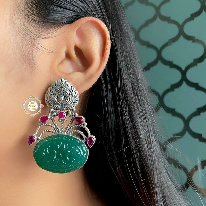 What you have here is a complete blend of being vintage and being contemporary — something that's rétrograde at heart and art moderne by design. An absolute stunner, these Nazaakat Exclusive Hand Carved Stone Earrings will turn the limelight on your elegant styling and trad-diva vibe. Embellished with metallic beads and realistic stones onto silver, these earrings find their insight in modern aesthetics and lively costumes. A statement piece like this is precise for casual as well as occasional wear. MATERIAL : STERLING SILVER 92.5