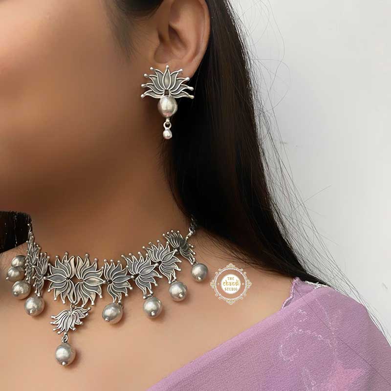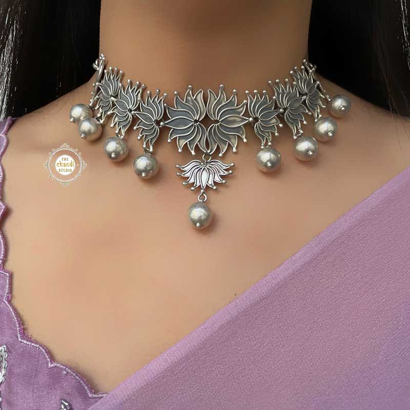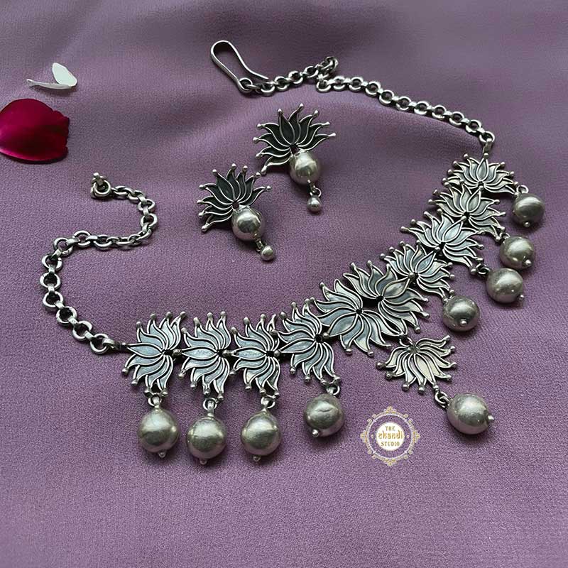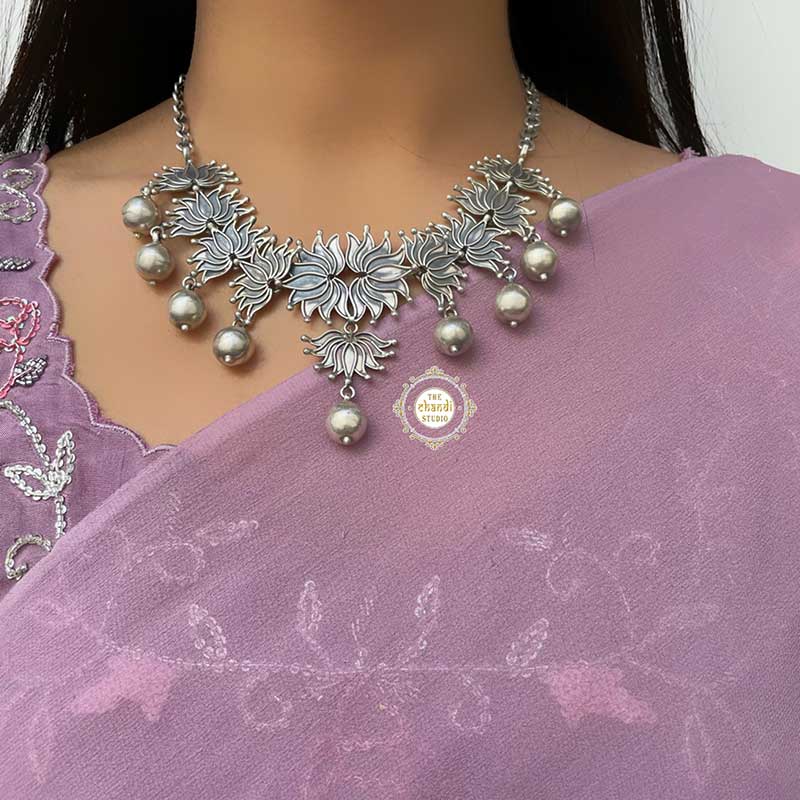Discover the Nazaakat Lotus Ball Drop Necklace Set, a blend of grace and modern elegance. Featuring intricately designed lotus motifs and sparkling ball drops, this set adds a sophisticated touch to any outfit. Ideal for weddings or formal events, it embodies timeless beauty and exquisite craftsmanship. Elevate your style effortlessly.