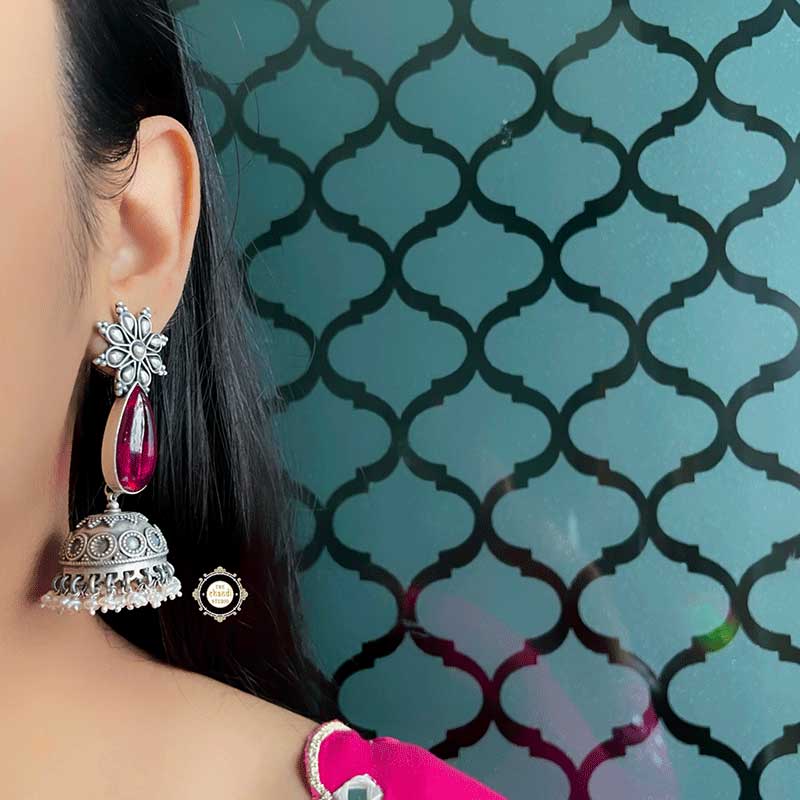 Let this monsoon wind joyfully play with your Jhumka and uplift your mood! Nazaakat Ruby Rawa Jhumki from our studio is designed with the finest skill embedded with teardrops and tiny pearl danglers bringing out its true refinement. This pair of Jhumkaa is the finishing touch to any ensemble; an elegant pair of earrings is both empirical and adorning, while the uniqueness is not only eye-catching but also timeless - it can be passed on to future generations. MATERIAL : STERLING SILVER 92.5