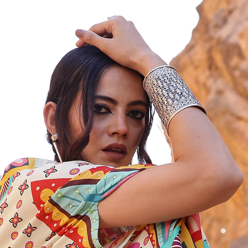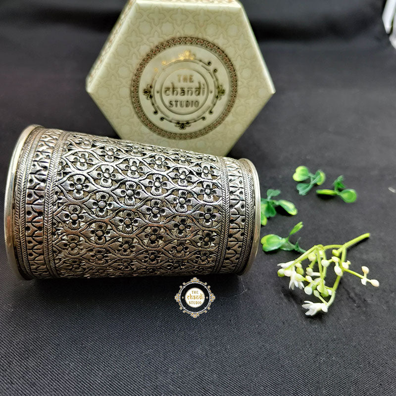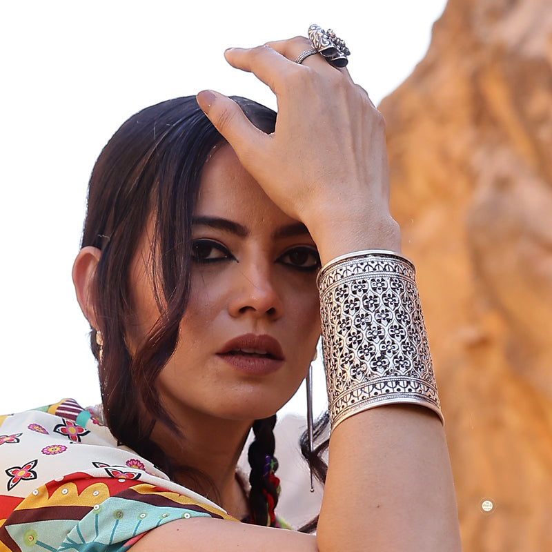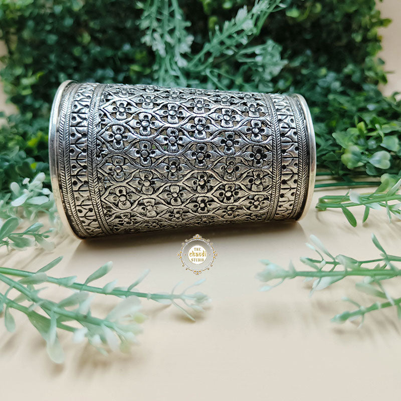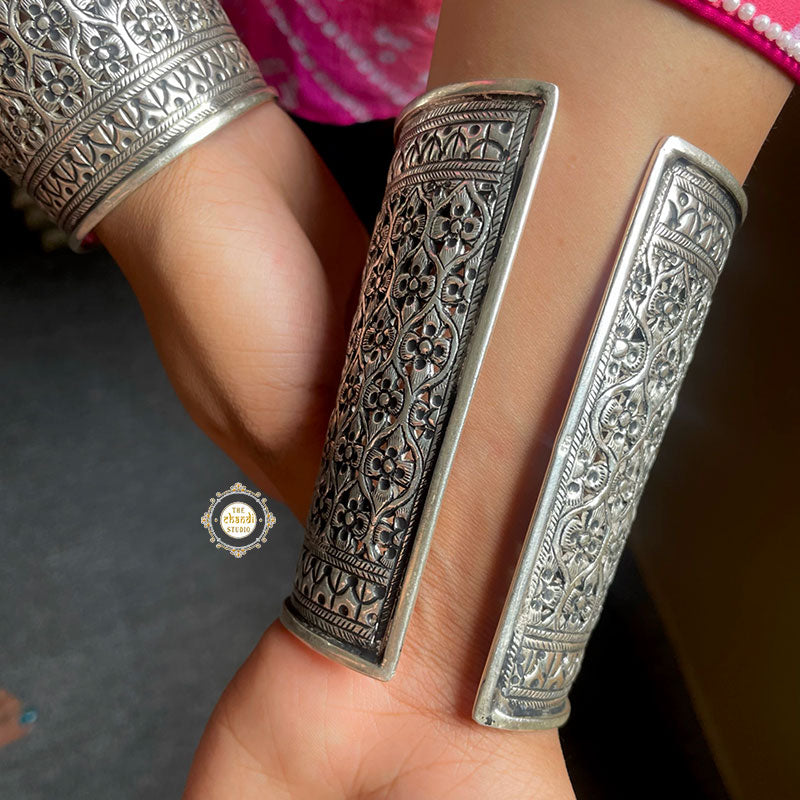Do you love the hand printed motifs on your handloom fabric? We have got it carved on silver metal to flaunt it around your wrist. Handcrafted by the artisans and embedded with traditionally inspired motifs, the Nazaakat Utsav Chitai Hand Cuff is elegant and sophisticated. With intricate craftsmanship and curiosity, this piece looks like floral motifs trapped in wave-like borders matching your embroidered fabrics and festive-ready mood. *Price mentioned is for a single piece. MATERIAL : STERLING SILVER 92.5
