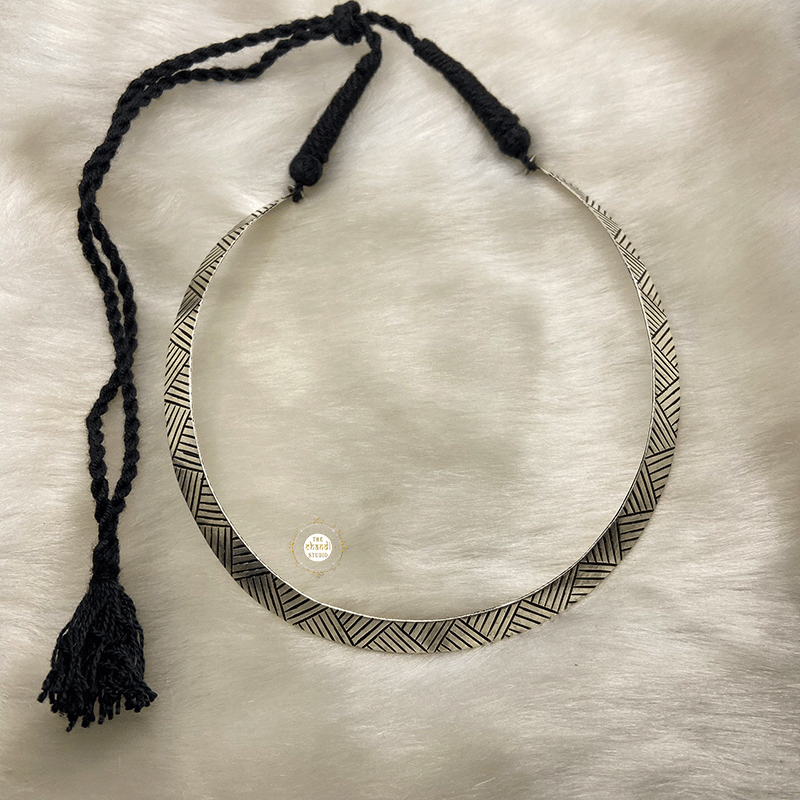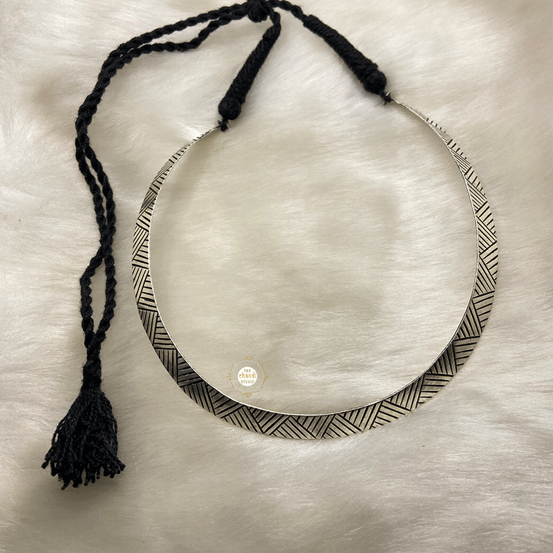 The Nazaara Hasli Necklace is a stunning neckpiece that combines traditional elegance with contemporary design. Crafted with precision, its intricate floral patterns and hammered texture exude regal charm. This statement piece, featuring a sturdy hasli design, beautifully complements ethnic attire, making it an exquisite accessory for special occasions.