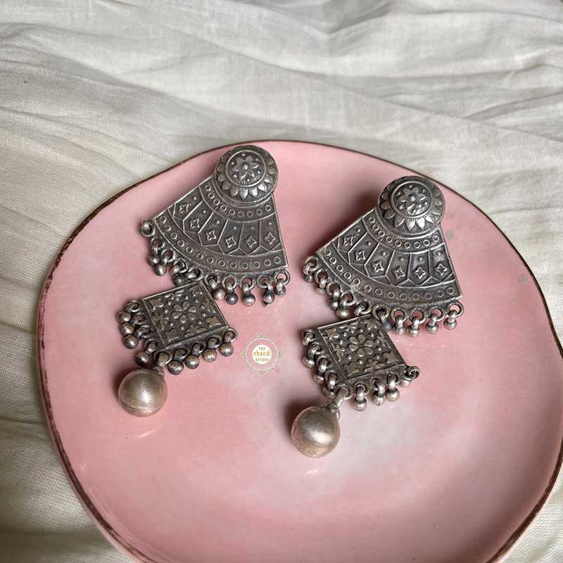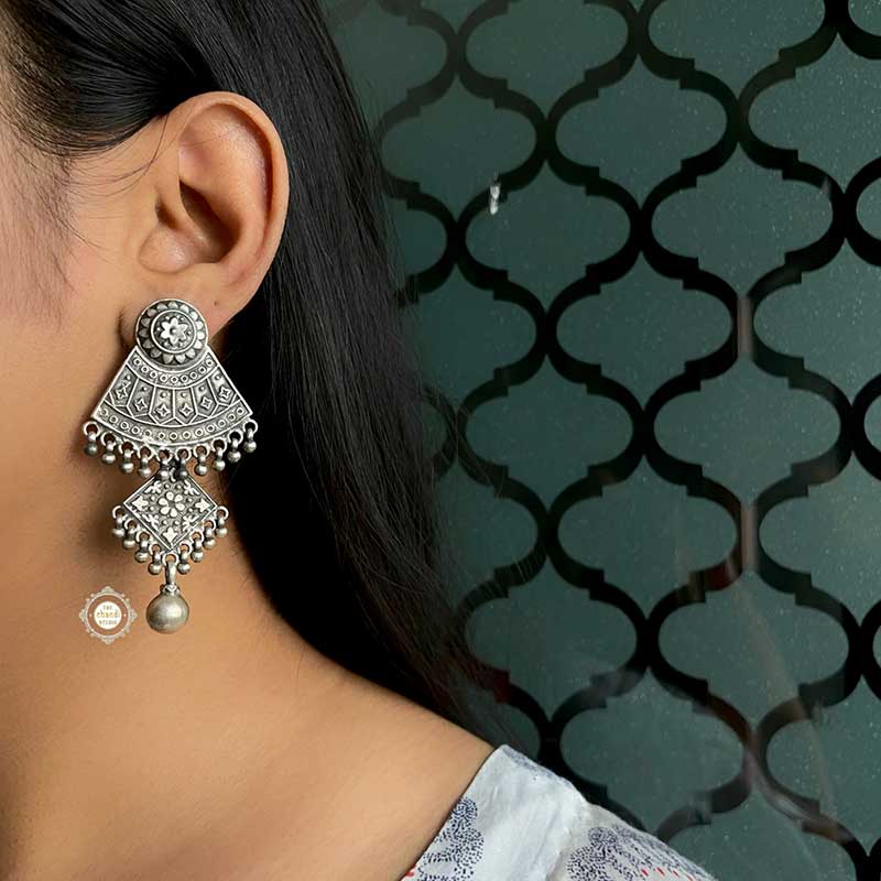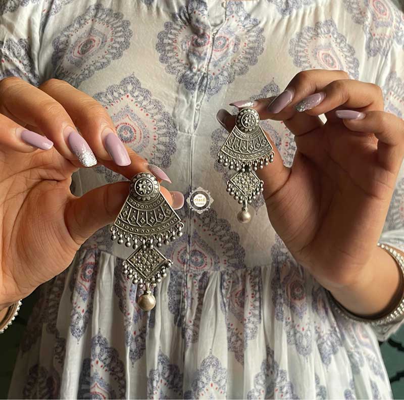 Chikankari, Kantha, Phulkari, Kutch - her grandmother taught her hand embroidery techniques and mirror work. Growing up is a complicated process and we explore and understand and appreciate a lot about ourselves. She developed an affinity towards silver and wanted to create beautiful motifs on the metal itself. Her first work was 'Noor Ball Drop Layered Earring' - made of intricate designs, ghungroo and love. Material - Sterling Silver 925