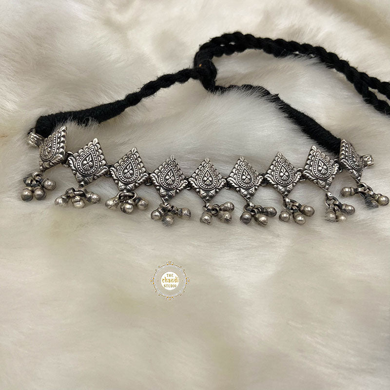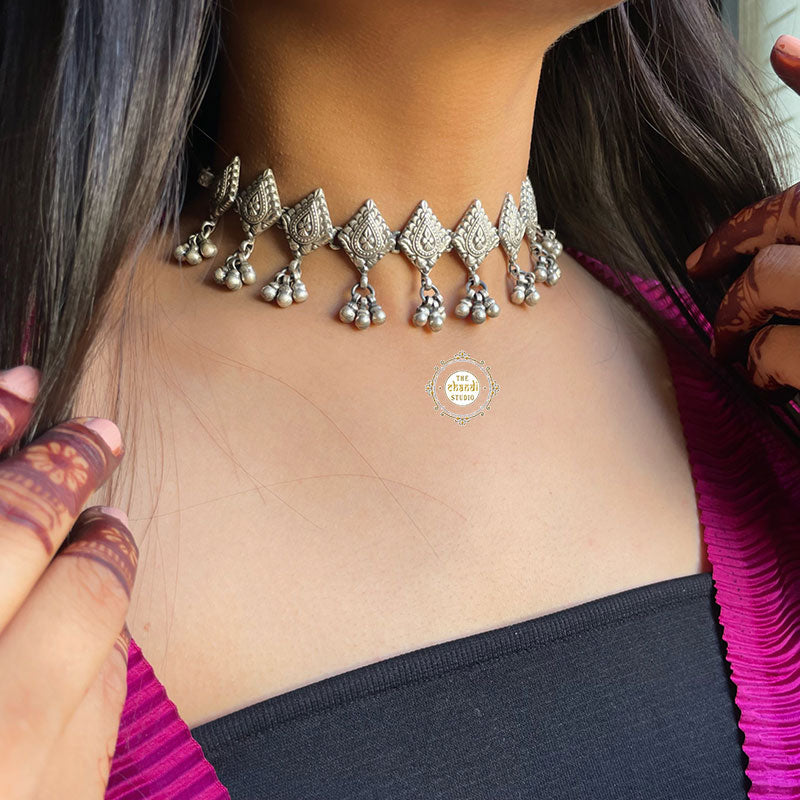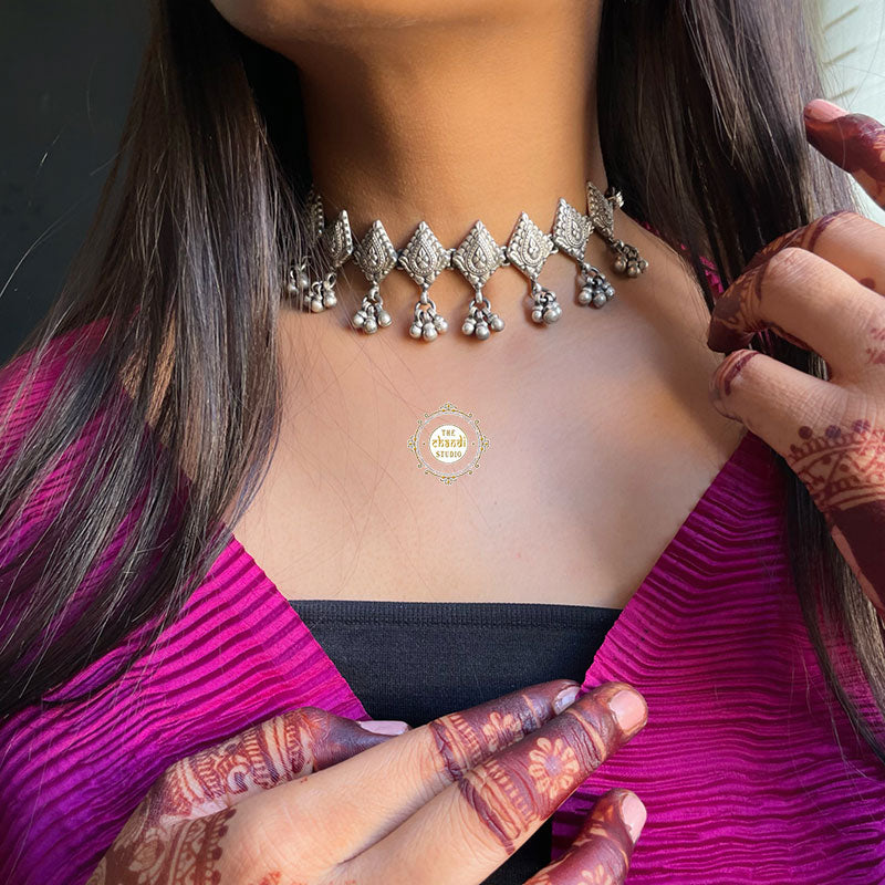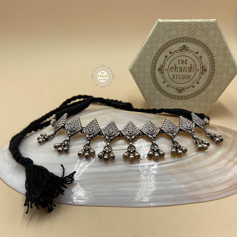 A neckpiece so playful, timeless & versatile! Whether it’s the festive season, your BFF’s mehndi or just about the daily style statement- our Noor Ghungroo Spade Choker seems to fit the bill for everything. Finished with an adjustable cotton thread. MATERIAL : STERLING SILVER 92.5