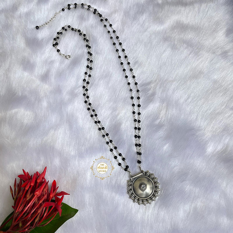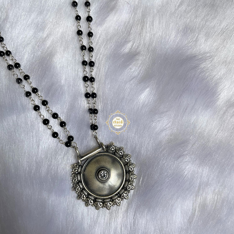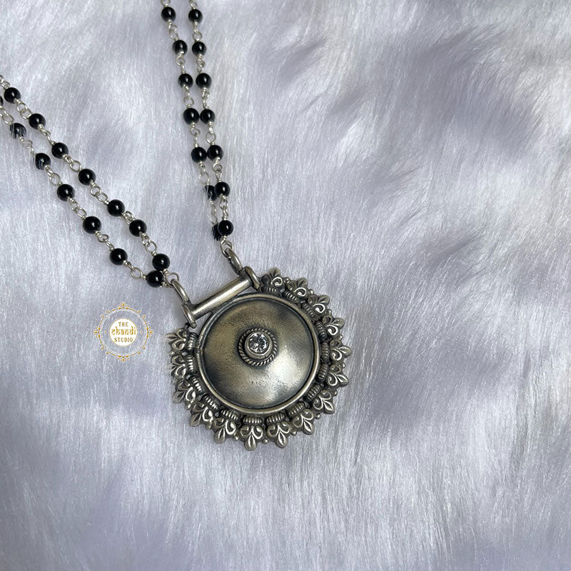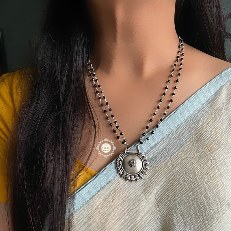 MATERIAL : STERLING SILVER 92.5 LENGTH : Chain – 20 inch including extension Pendant Length – 1.2 Inch & Width – 1.5 Inch Earring Length – 4 cm & Width – 3.3 cm With evolving times, women are leaving their old skin painted with social stigmas, mental taboos and physical prejudices. Women understand the importance of rituals but don't want that to be a barrier in everyday life. Noor Intricate 'Timeless Embossed' Mangalsutra is classy, contemporary and modern but with a old soul. This goes well with your Office wear, Traditional outfits or Western dresses. Versatile and fashionable, this is for the women who respect rituals but love to adapt them in their own respectful ways.