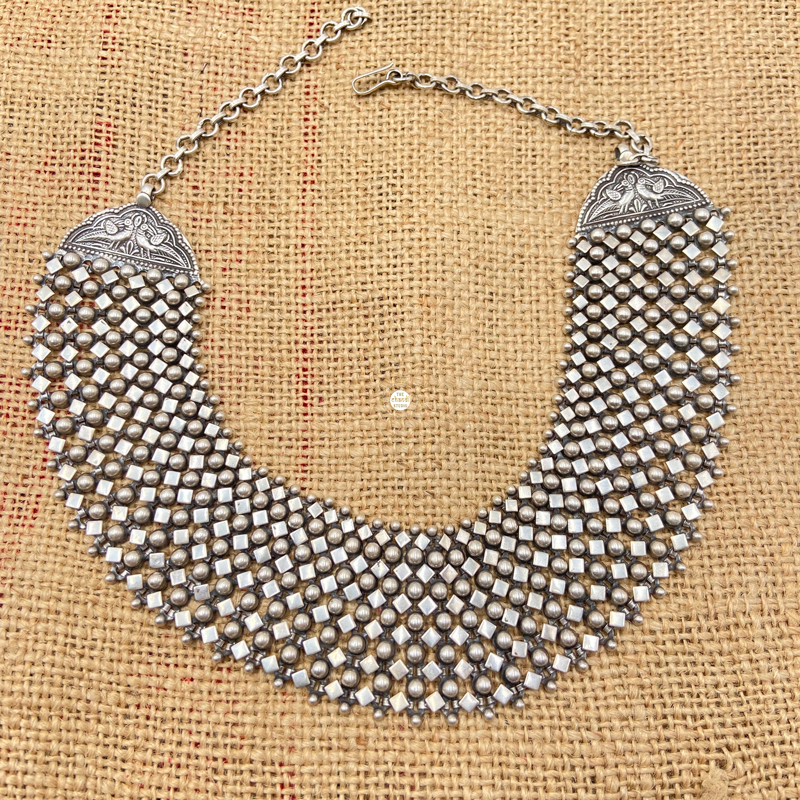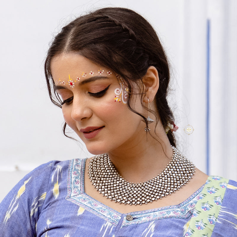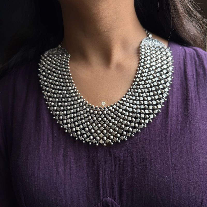Noor Intricate Timeless Necklace worn with traditional Indian attire such as sarees, lehengas, and salwar kameez. It is worn around the neck and can be styled in various ways, such as layering multiple necklaces together or pairing it with other traditional jewelry like jhumkas or bangles. Material: Sterling Silver 92.5
