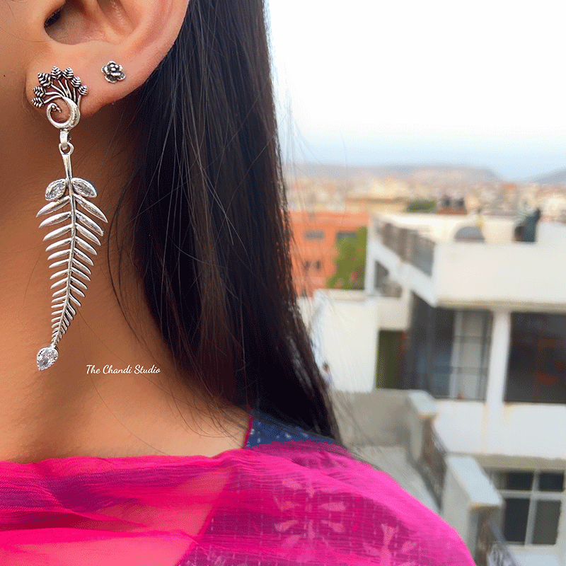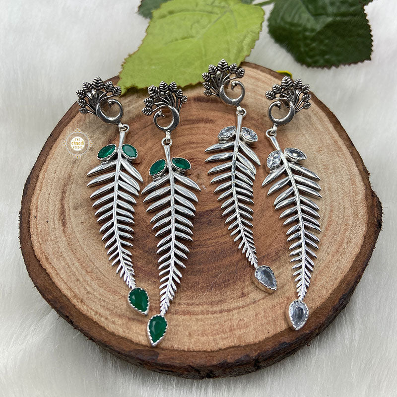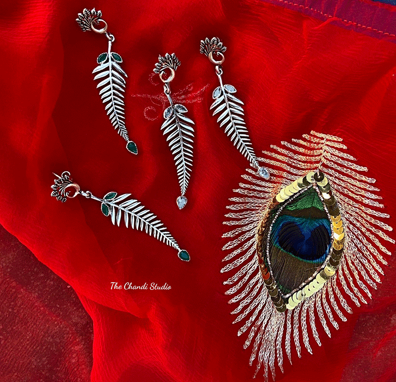 Peacock feather Earrings are feature with feather of a peacock, in a decorative or ornamental design. Peacock feathers are also considered a symbol of beauty and elegance in many cultures. PIHU, an eye-catching design featuring a delicate peacock stud which drops down into a feather embellished with stones. MATERIAL – STERLING SILVER 92.5