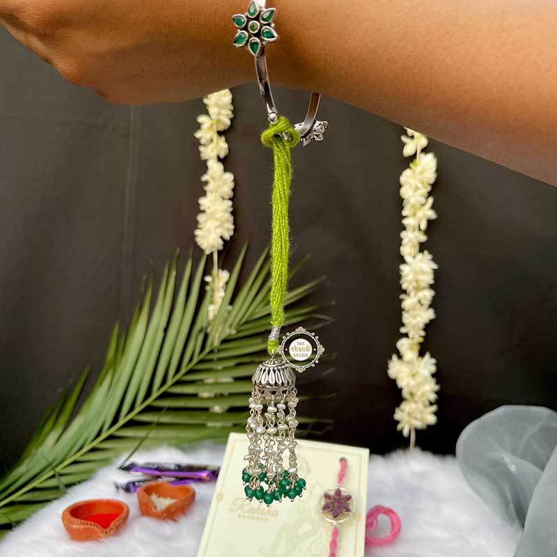 *Bangle is for photography purpose only. Price mentioned is for the lumba rakhi only. A sibling may be the keeper of one's identity, secrets, vulnerabilities - the only person with the keys to one's unfettered, more fundamental self. Rakhi is a celebration of this pure bond that may be out of blood relationship or by behaviour. This Chuda Rakhi by The Chandi Studio celebrates the bond between sisters, brothers, and anyone who held your back in the toughest of times. One for the person you call home. *Every package comes with Roli, Chawal and a Dairy Milk.