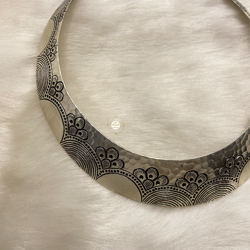 The SuryaPhool Hasli Necklace is a stunning neckpiece that combines traditional elegance with contemporary design. Crafted with precision, its intricate floral patterns and hammered texture exude regal charm. This statement piece, featuring a sturdy hasli design, beautifully complements ethnic attire, making it an exquisite accessory for special occasions.