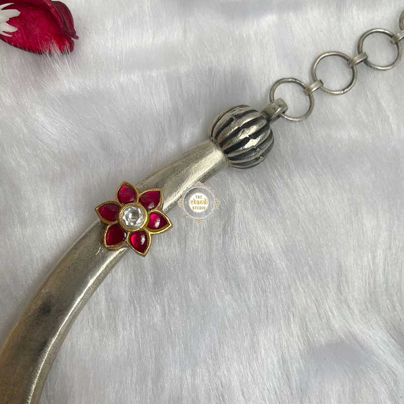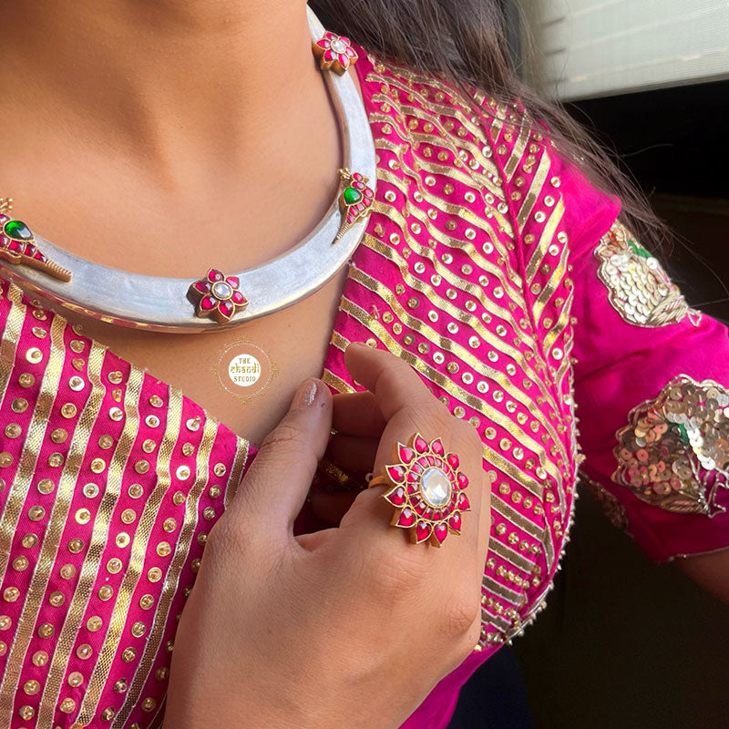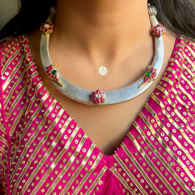 The Rajwada Shahi Kundan Hasli brings a striking variation in a bride’s jewellery box, and a maiden’s jewelry pouch. Pair it with a designer lehenga or an elegant saree and get the regal look.