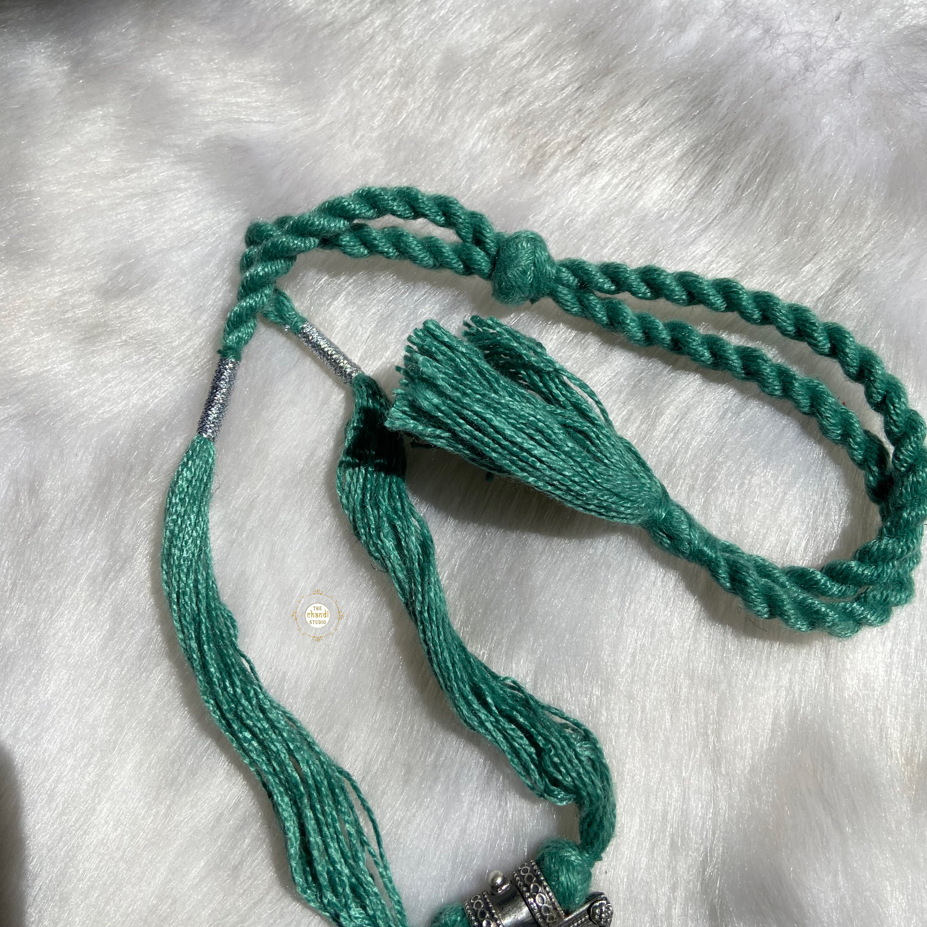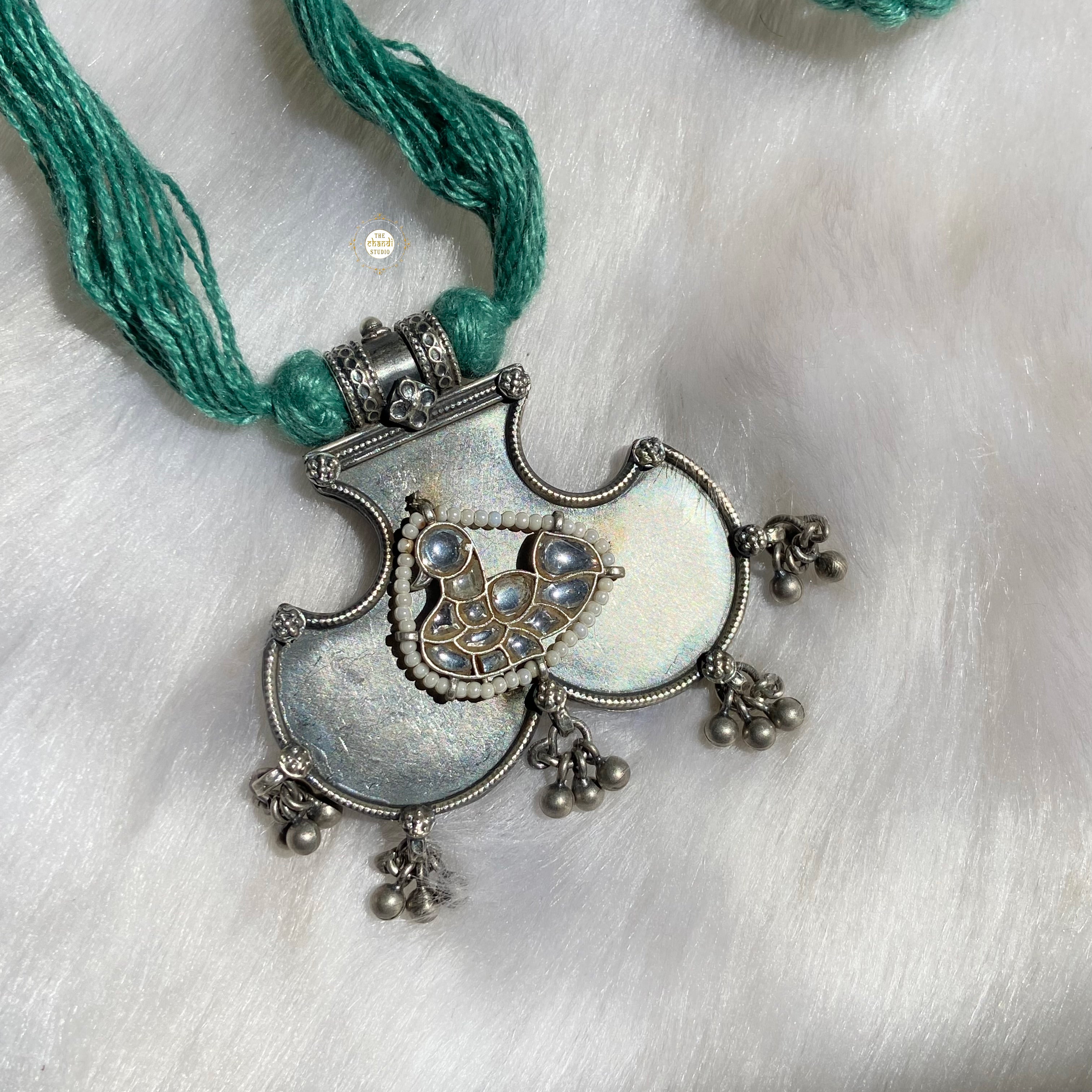 Elevate your ethnic style with the Ruhani Threads Necklace—a handcrafted silver-tone statement piece featuring floral accents and soft green threads. Perfect for festive looks, boho vibes, or everyday elegance.
