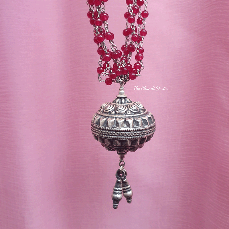 A beautiful Ruby necklace with a fine emboss pendant. MATERIAL - STERLING SILVER 92.5 Length-20'' without extension ( Extension-6'')
