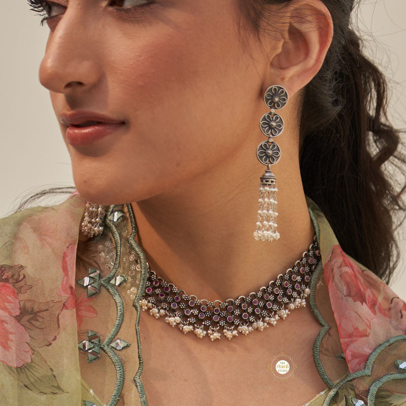 A beautiful design that gives you a reason to dress up and strike a statement style. Our eternal love for freshwater pearls is transformed into elegant Ruhaniyat Flower Motif Pearl Jhumki Material - Sterling silver 925