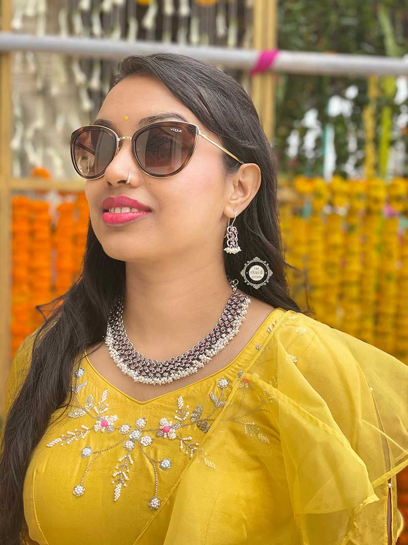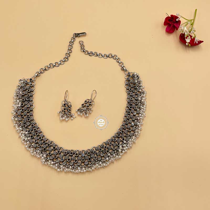 With intricate rawa work, fine quality stones & bunch of freshwater pearls, this versatile set can’t just disappoint anyone. Designed keeping the modern you in mind. Absolutely classic and timeless. Necklace Length - 11.5' Inches Width - 1' Inches Length of Links- 7' Inches Earring Length - 1.5' Inches *Prices mentioned are inclusive of earring MATERIAL : STERLING SILVER 92.5