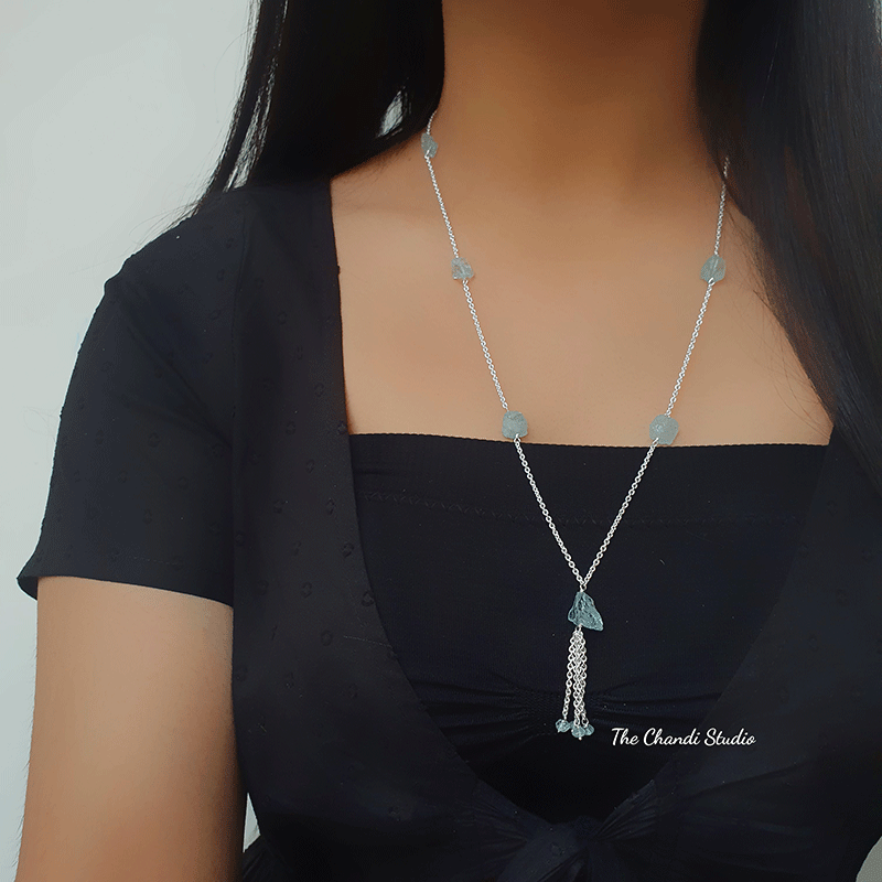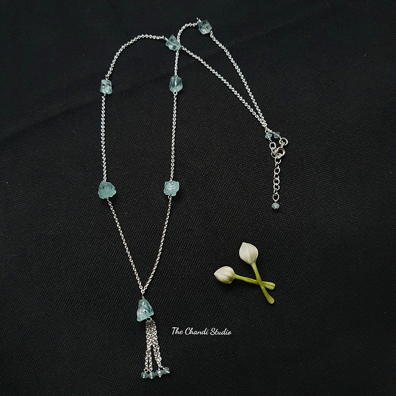 Aquamarine, a stone of Eternal Youth and Happiness. It is cleansing, soothing and calming and represents truth, trust and letting go. Each vary in size, shape and colour, so wearers feel even more connected to Mother Nature as they explore the world each day. Team with jeans and a flowing cami for a relaxed look and let your statement necklace do the talking. MATERIAL : STERLING SILVER 92.5 LENGTH - 24 inches (excluding pendant)
