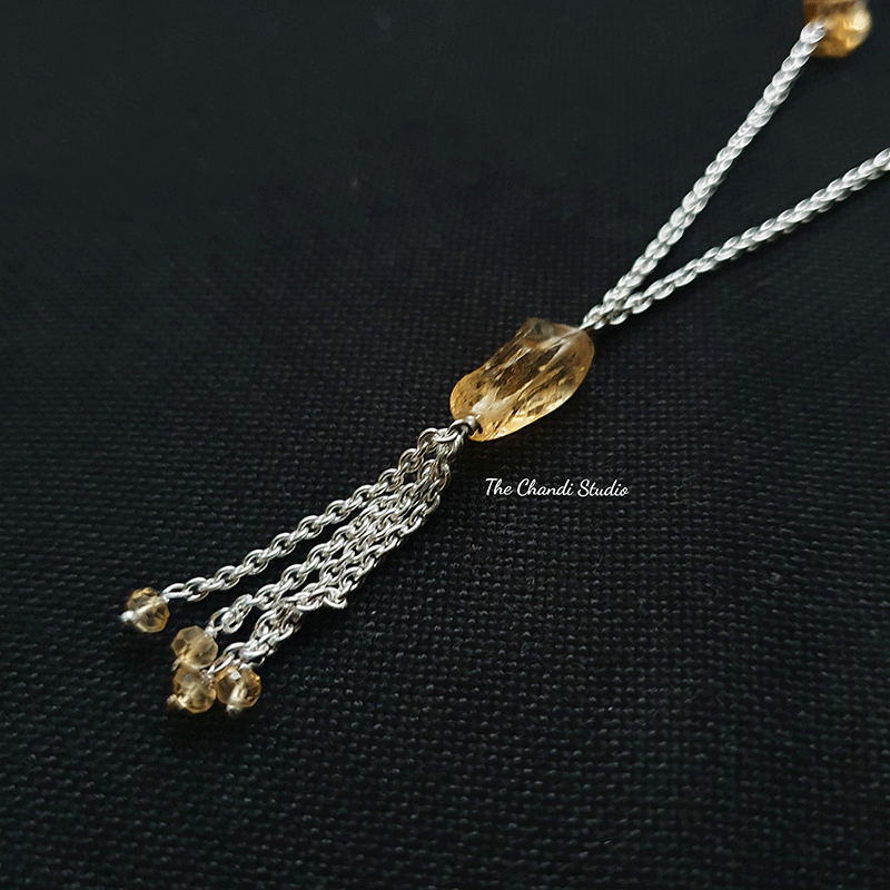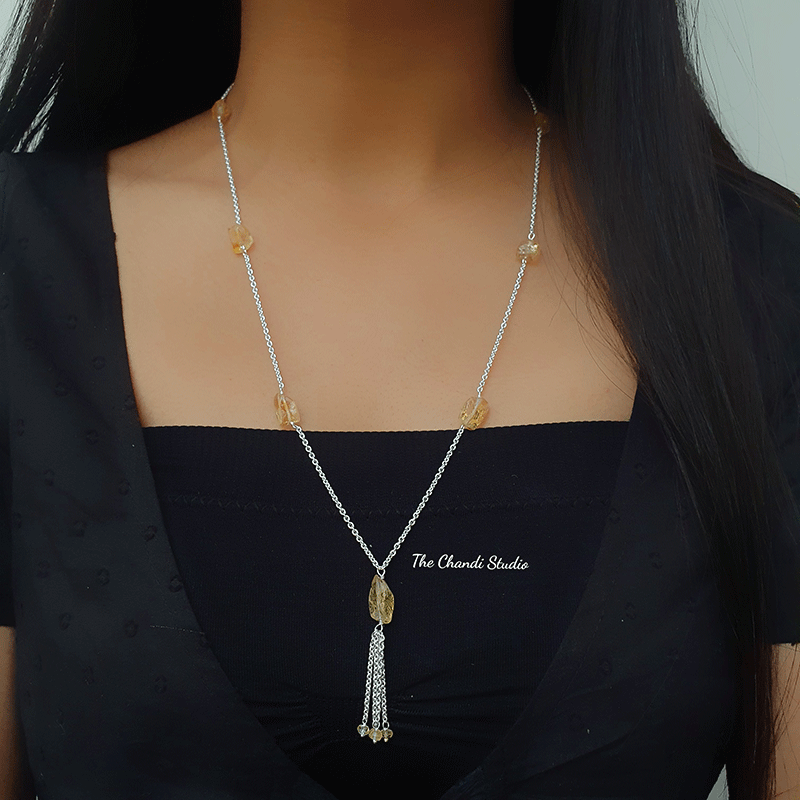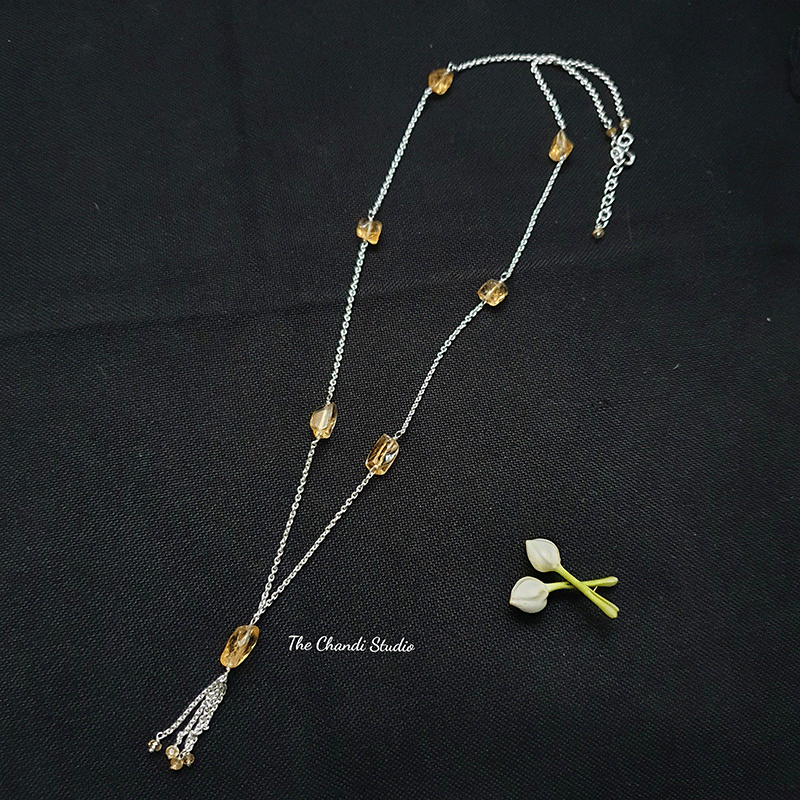 Hand-crafted using freeform citrine, this natural citrine necklace is truly one-of-a-kind. Each vary in size, shape and colour, so wearers feel even more connected to Mother Nature as they explore the world each day. Team with jeans and a flowing cami for a relaxed look and let your statement necklace do the talking. MATERIAL : STERLING SILVER 92.5 LENGTH - 24 inches (excluding pendant)
