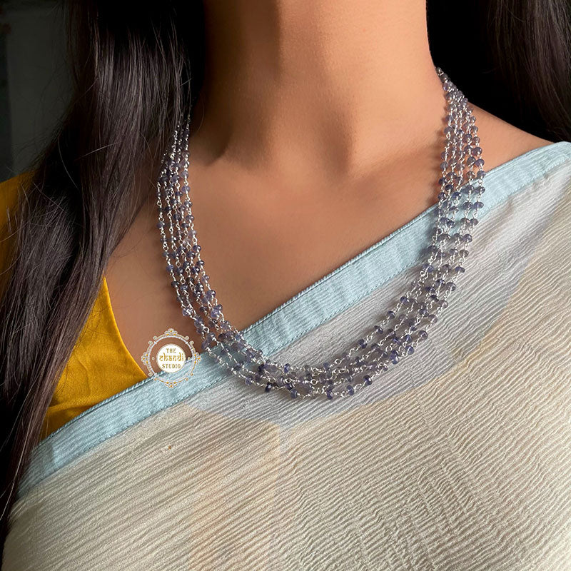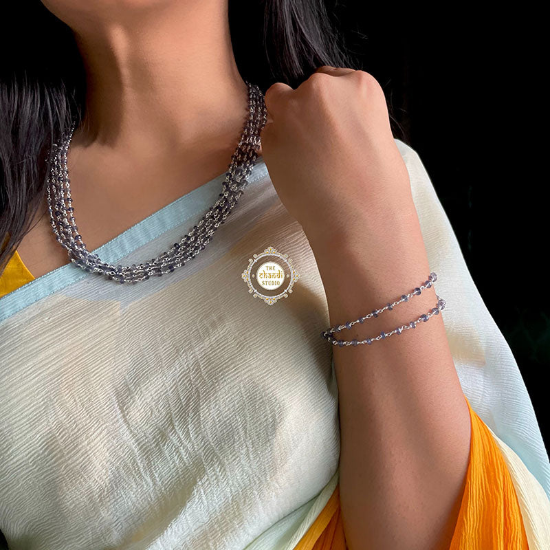 Like all the moods of the ocean under sunlight or storm clouds, Ioliote is a gemstone that is full of life. With its shifting clouds and clean energy, Iolite blends beauty and incredible energy making it a stunning choice for your gemstone jewelry collection. Even beyond the borders of beauty, wearing it comes with a bounty of benefits. Iolite pressed close to the skin can send all that uplifting spiritual energy directly to your soul. Having direct contact to your pulse points and your own vibrations invites Iolite to truly connect to who you are and to align its high vibrations with your unique sense of energy. Length - 21 inches MATERIAL : STERLING SILVER 92.5