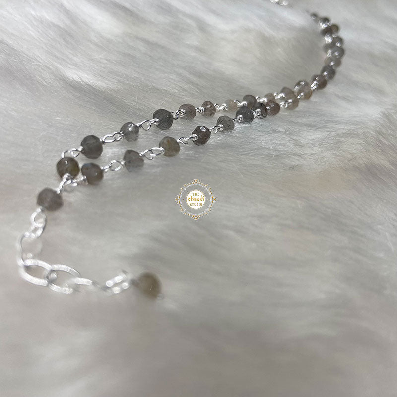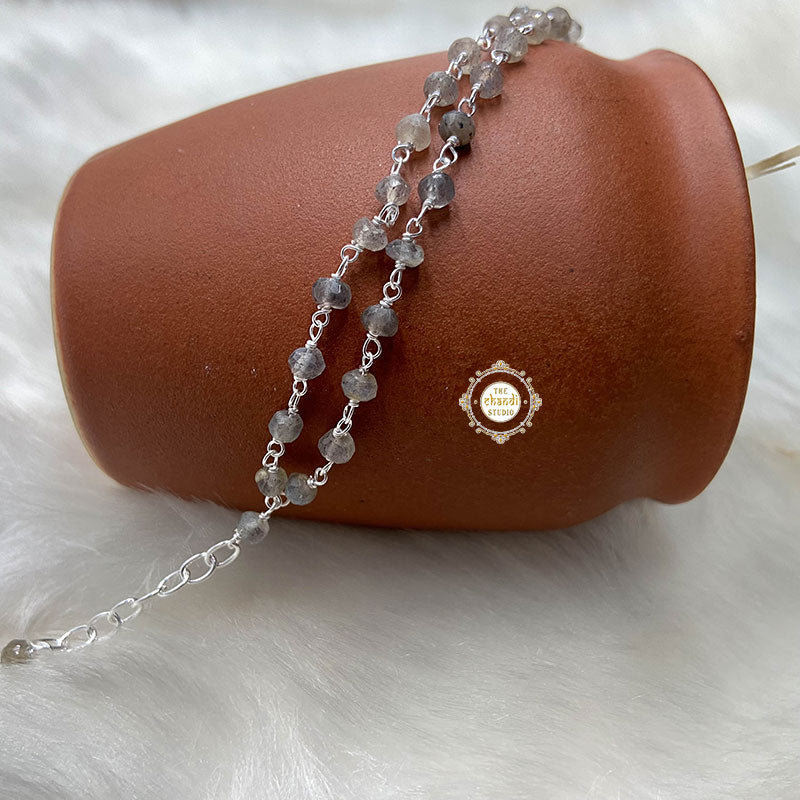 Rustic Romance Labradorite Bracelet with Semi Precious Stones   Plunge into the cool coloring of Labradorite gemstone. Glimmering in it hues, this soulful stone is said to bestow truth, honor & integrity to its wearer. Its energies can give you a sense of purposefulness, and it will help you develop new ideas or find joy and enthusiasm in what you are doing. Min. Length – 6.5 inches Max. Length – 7.5 inches MATERIAL : STERLING SILVER 92.5