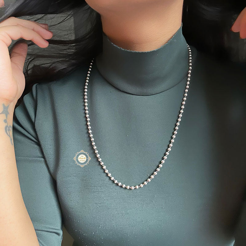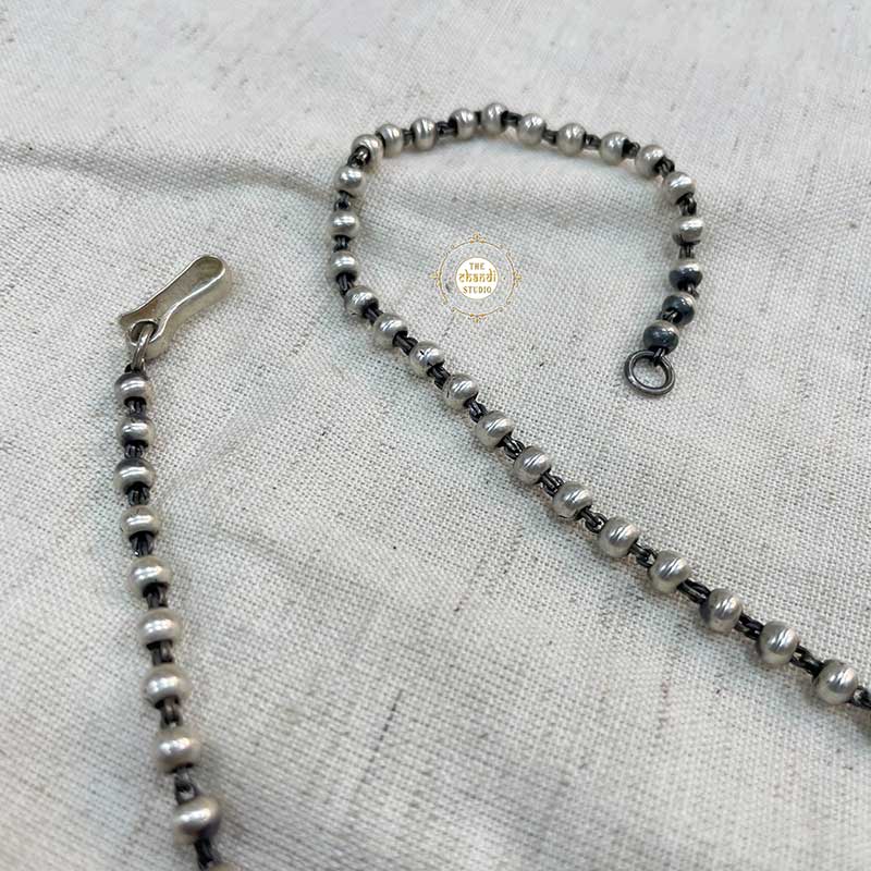 The Sadabahar Versatile Ball Necklace from our studio will bring back the best of your childhood remembrances of having joyful memories with your mom or grandmom by collecting beads and making beautiful necklaces out of them. These pieces of jewelry are all about you - they have an emotional connection to the important moments of your life. This silver single chain beaded jewelry can be used to smarten up a beadwork saree or casual salwar kameez or office wear. Though minimal and dainty, the charming necklace is utterly fascinating and versatile as well. MATERIAL : STERLING SILVER 92.5