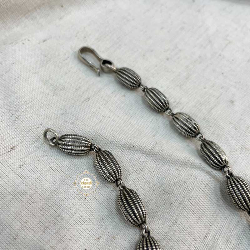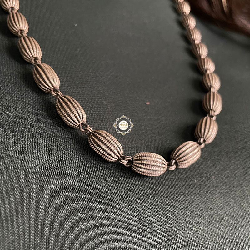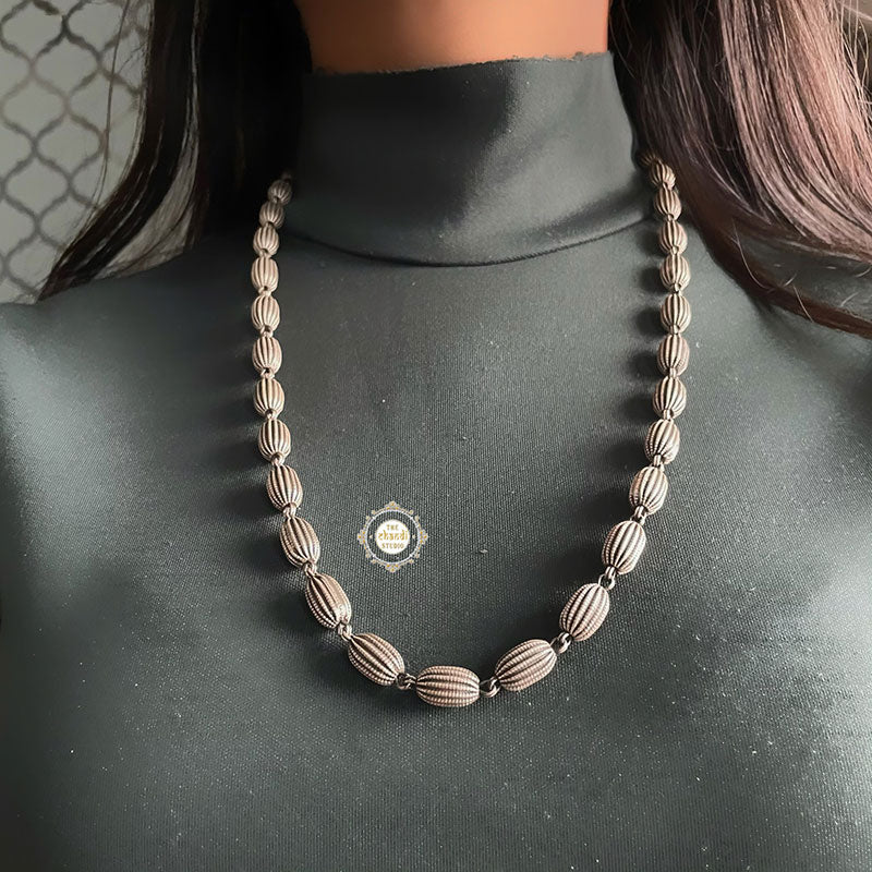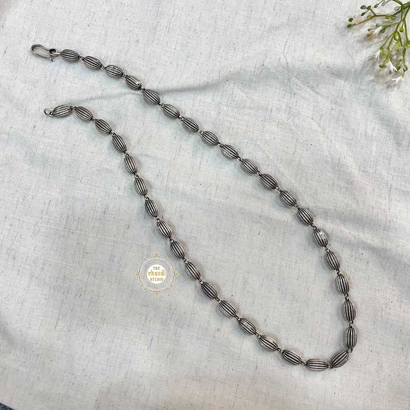 The Sadabahar Versatile Bead Necklace from our studio will bring back the best of your childhood remembrances of having joyful memories with your mom or grandmom by collecting beads and making beautiful necklaces out of them. These pieces of jewelry are all about you - they have an emotional connection to the important moments of your life. This silver single chain beaded jewelry can be used to smarten up a beadwork saree or casual salwar kameez or office wear. Though minimal and dainty, the charming necklace is utterly fascinating and versatile as well. MATERIAL : STERLING SILVER 92.5 Length of chain : 25 inches