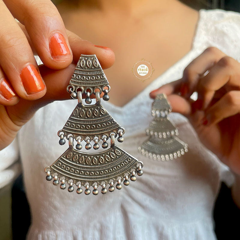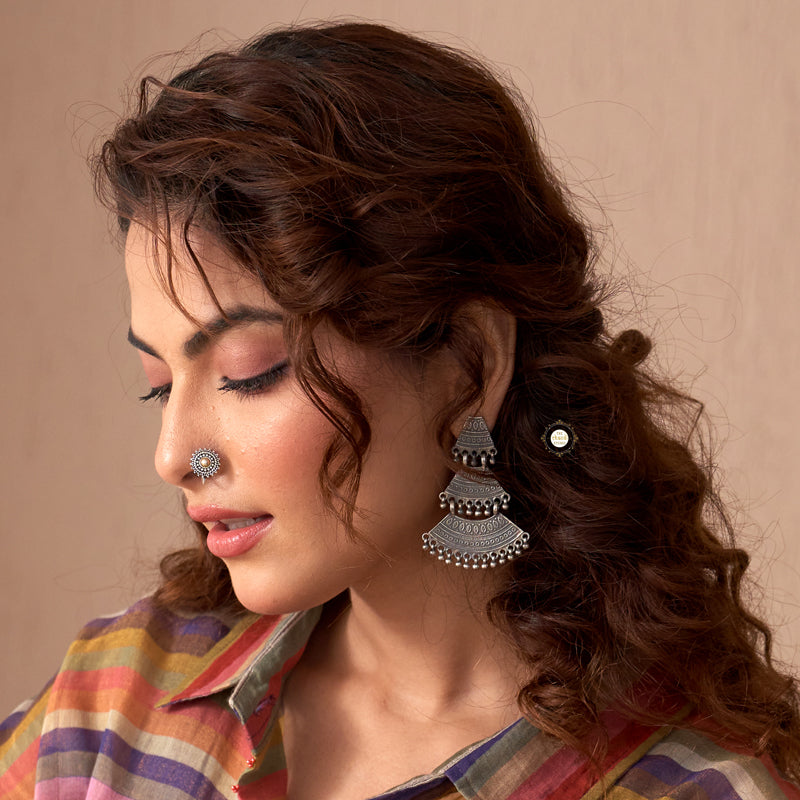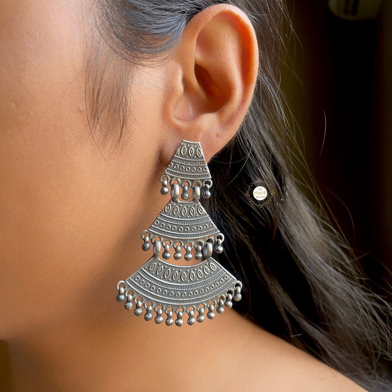 Grown inside ocean creatures, pearls are her favourite sort of beads. Silver, imperfect and yet the most beautiful thing found inside the sea. Feel beautifully imperfect with this intricate motif work earring that we lovingly call 'Sadabhar Bell Earring'. The danglers, crochet motifs and the triple layer look of the earring pair makes you uniquely decked up. Pair it with simple hand printed sarees, embroidered long skirts, ripped jeans, and turtle neck tops and feel the boho vibes. MATERIAL : STERLING SILVER 92.5
