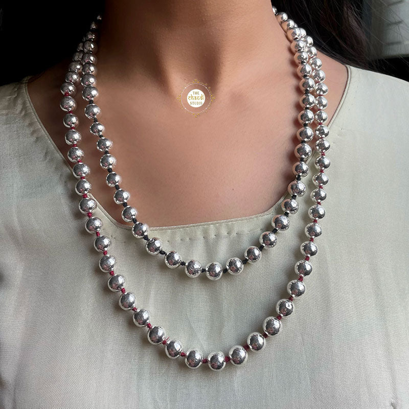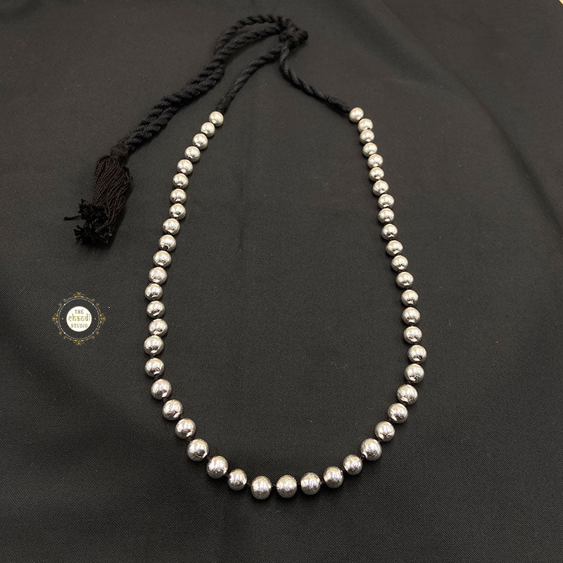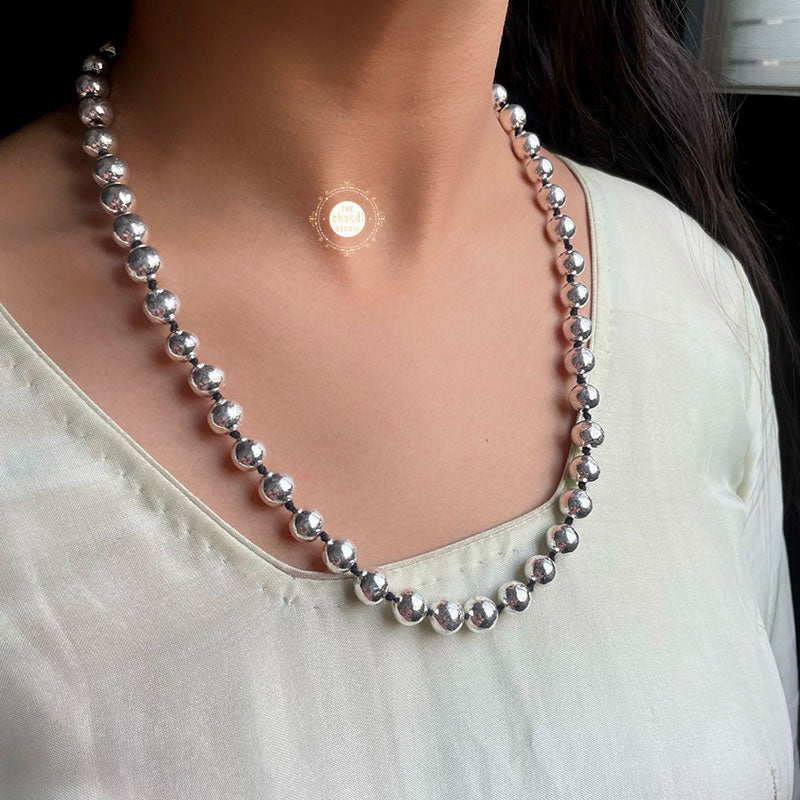 The Sadabahar Ball Thread Necklace from our studio will bring back the best of your childhood remembrances of having joyful memories with your mom or grandmom by collecting beads and making beautiful necklaces out of them. These pieces of jewelry are all about you – they have an emotional connection to the important moments of your life. This silver beaded jewelry can be used to smarten up a beadwork saree or casual salwar kameez . Though minimal and dainty, the charming necklace is utterly fascinating and versatile as well. MATERIAL : STERLING SILVER 92.5
