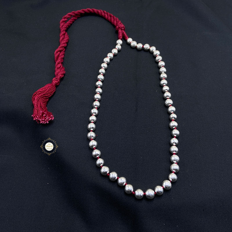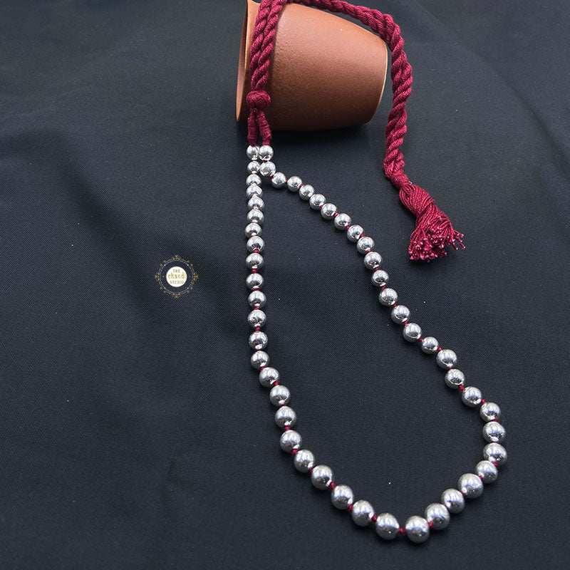 The Sadabahar Ball Thread Necklace from our studio will bring back the best of your childhood remembrances of having joyful memories with your mom or grandmom by collecting beads and making beautiful necklaces out of them. These pieces of jewelry are all about you – they have an emotional connection to the important moments of your life. This silver beaded jewelry can be used to smarten up a beadwork saree or casual salwar kameez . Though minimal and dainty, the charming necklace is utterly fascinating and versatile as well. MATERIAL : STERLING SILVER 92.5