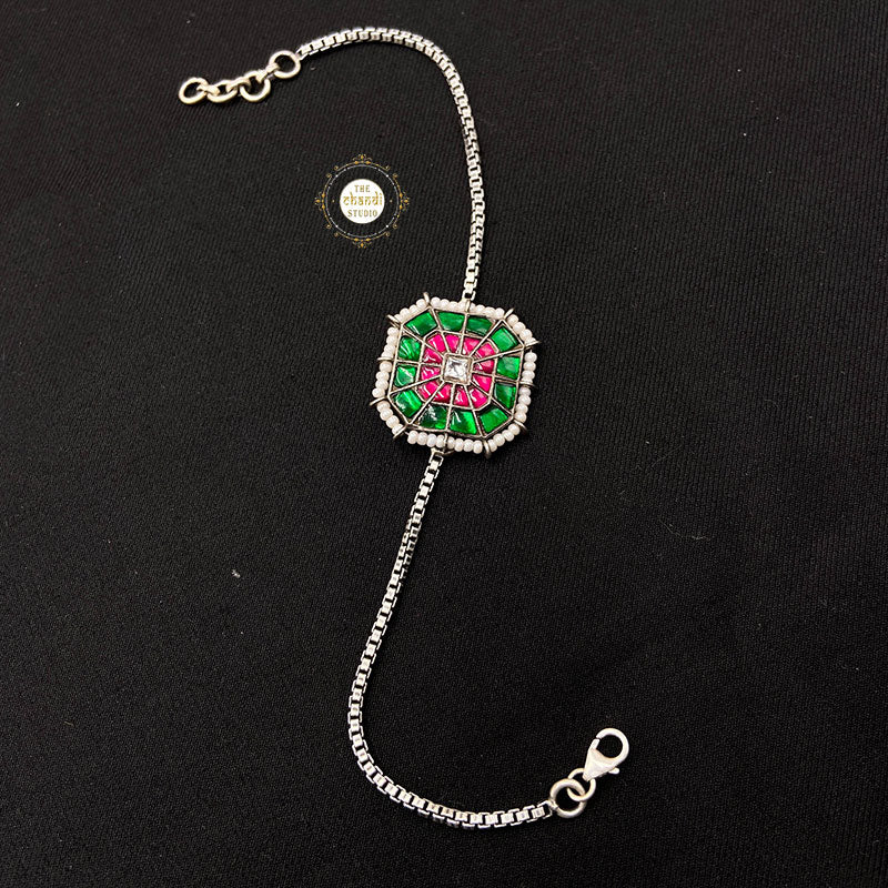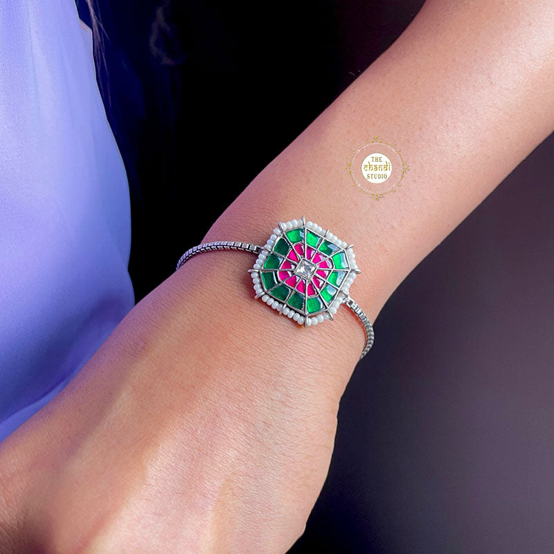 Indulge in regal opulence with our Shahi Kundan Bracelet. Inspired by the grandeur of Indian royalty, this exquisite piece showcases the artistry of Kundan work, where meticulously set gemstones and intricate detailing create a mesmerizing display of elegance.   Crafted with meticulous care and attention to detail, this bracelet exudes an air of majestic splendor.   Its adjustable design ensures a comfortable fit, allowing you to adorn your wrist with confidence and grace. Experience the allure of timeless beauty and elevate your style with the captivating Shahi Kundan Bracelet.   Size :  Min. Length – 7.5 inch Max. Length – 8.5 inch Width – 1 inch   * The price mentioned is for single piece only * Material : Sterling Silver 925