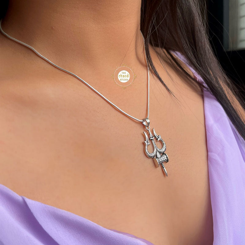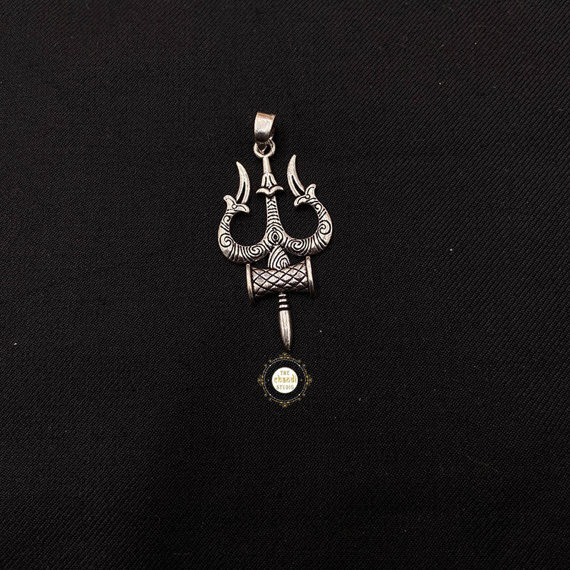 Discover the essence of divine trinity with our Shiva Trishul Pendant. Handcrafted with utmost precision in sterling silver, this pendant is a profound symbol of creation, preservation, and destruction.   Embrace the spiritual path and invoke the transformative energy of Lord Shiva. Let this remarkable piece be a reflection of your inner strength and spiritual journey. Elevate your style and spirituality with the Shiva Trishul Pendant.   * MATERIAL – STERLING SILVER 92.5 * Price mentioned is only for the pendant.