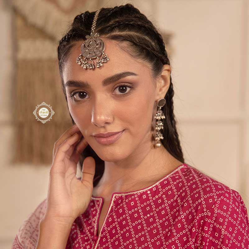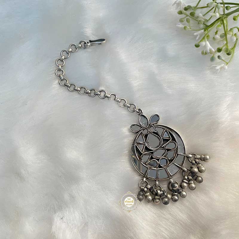 One day, someone will look at you the same way you look at the moon. Isn't it good if someone mirrored it for you because then, you can witness how your expression changes from vulnerable to valiant. That's the power of self-love. It may change in magnitude like the phases of the moon but you should always look at your soul and terrestrial being in the mirror - be proud of yourself for fighting your battles alone, look into your eyes and let the glass reflect a wiser and stronger you. Soulful Sheesha Chaand Maang Tika is a priceless addition to your personality and wardrobe ❤️ LENGTH : 7 inches WIDTH : 1.5 inch MATERIAL : STERLING SILVER 92.5