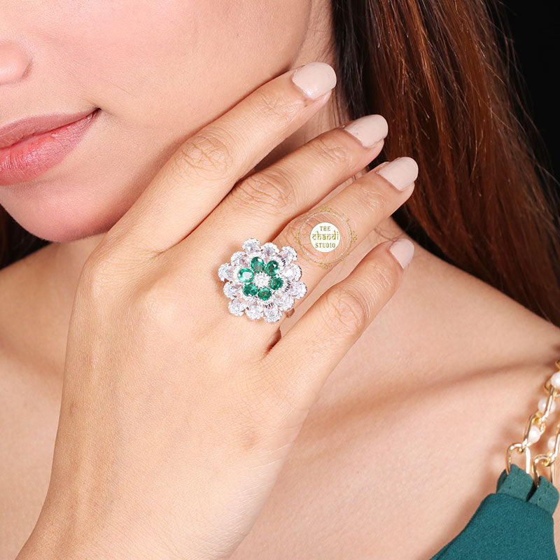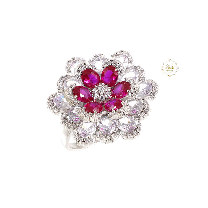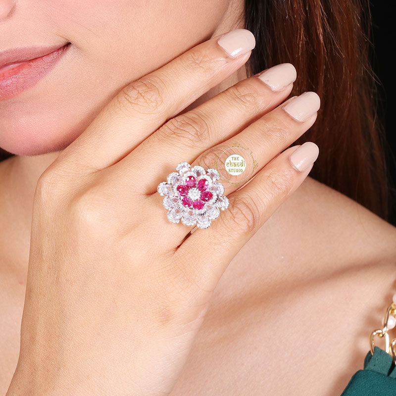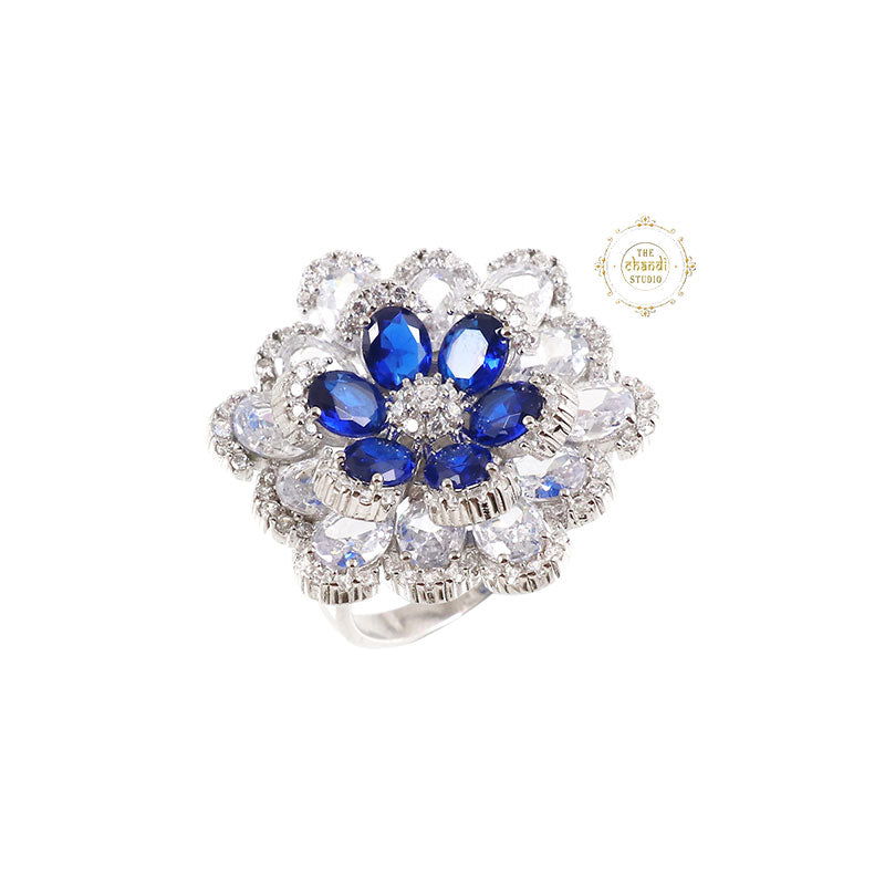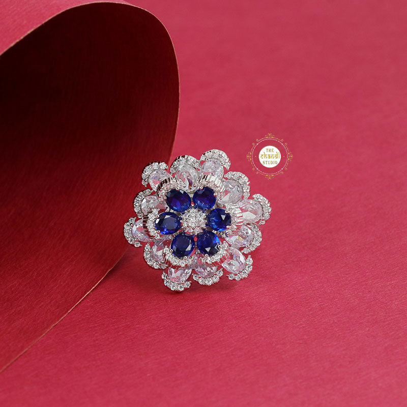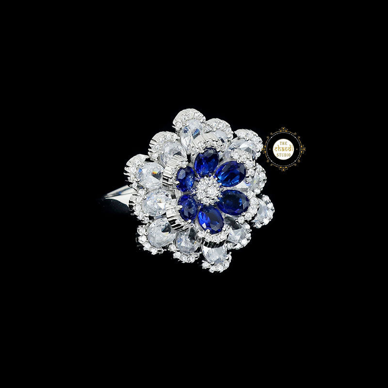 Adorn your fingers with the Sparkling Sapphire Bloom Ring, featuring a radiant sapphire centerpiece surrounded by delicate silver petals. This elegant design exudes charm, making it a perfect statement of sophistication.