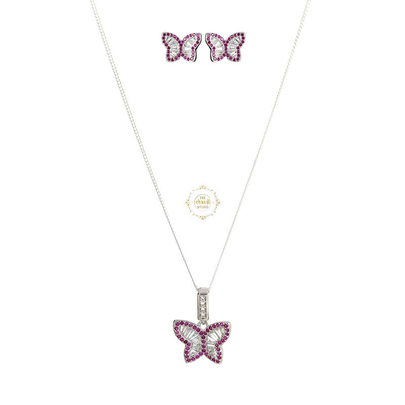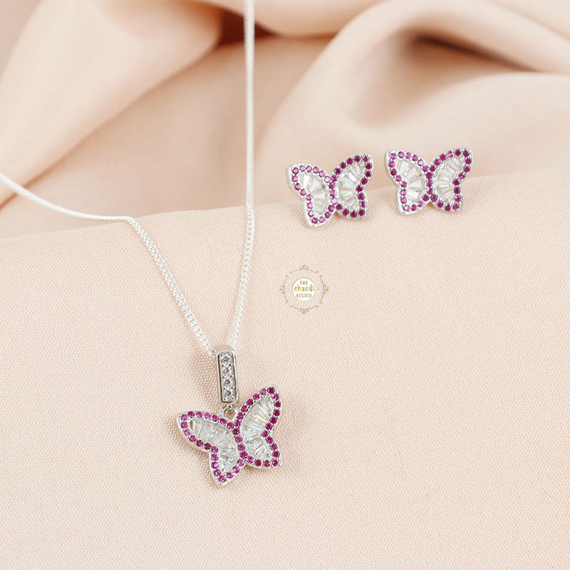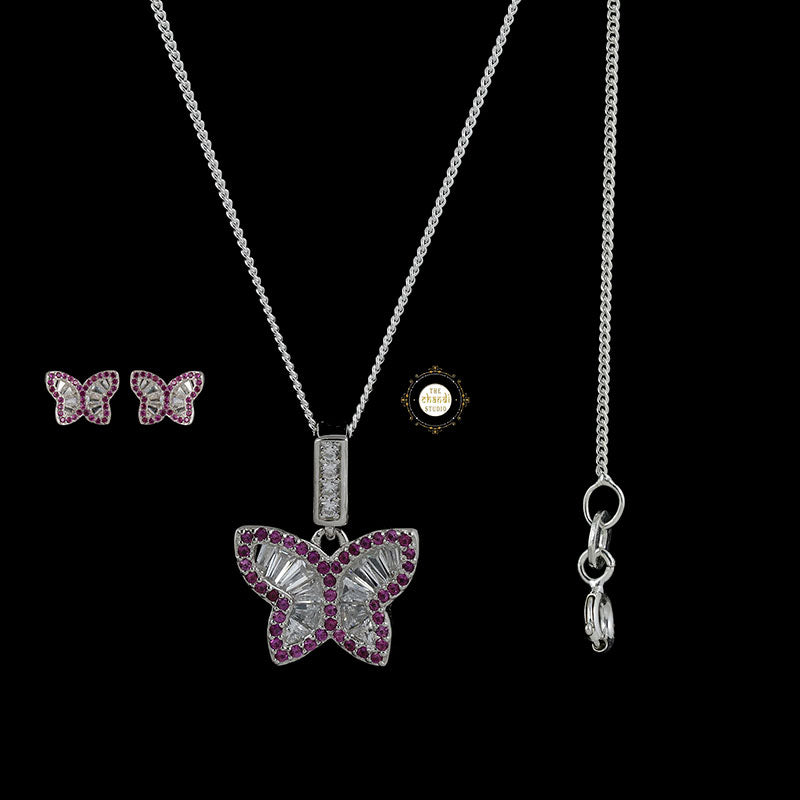 Ward off negativity in style with the Sparkling Silver Blushing Butterfly Necklace with earring Crafted in sterling silver with a shimmering evil eye charm, it offers protection and elegance, perfect for everyday wear.