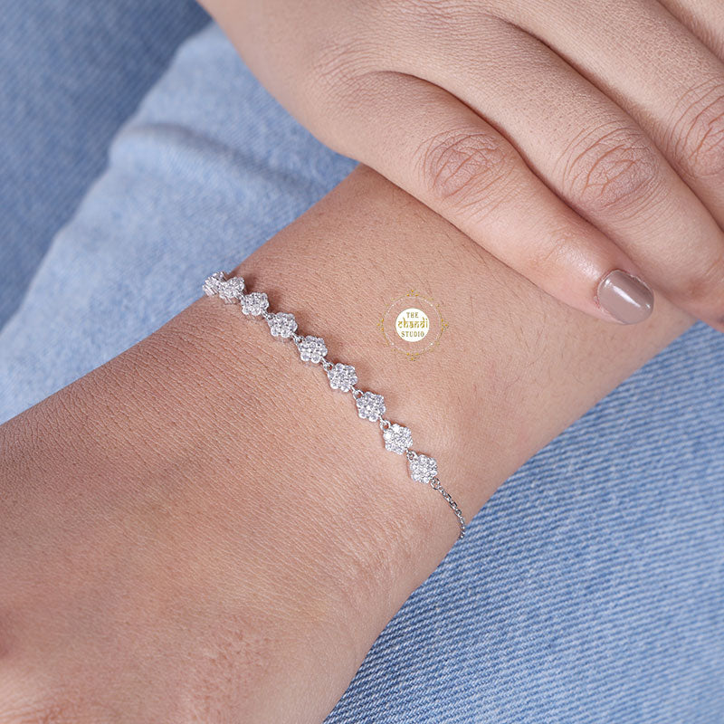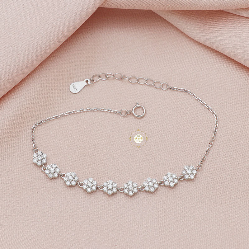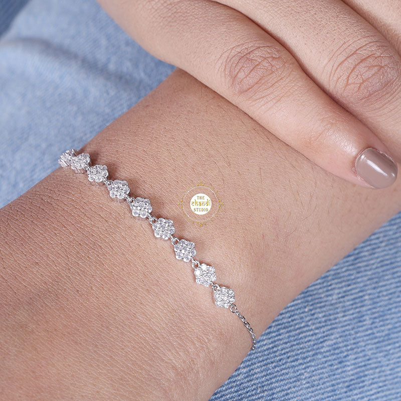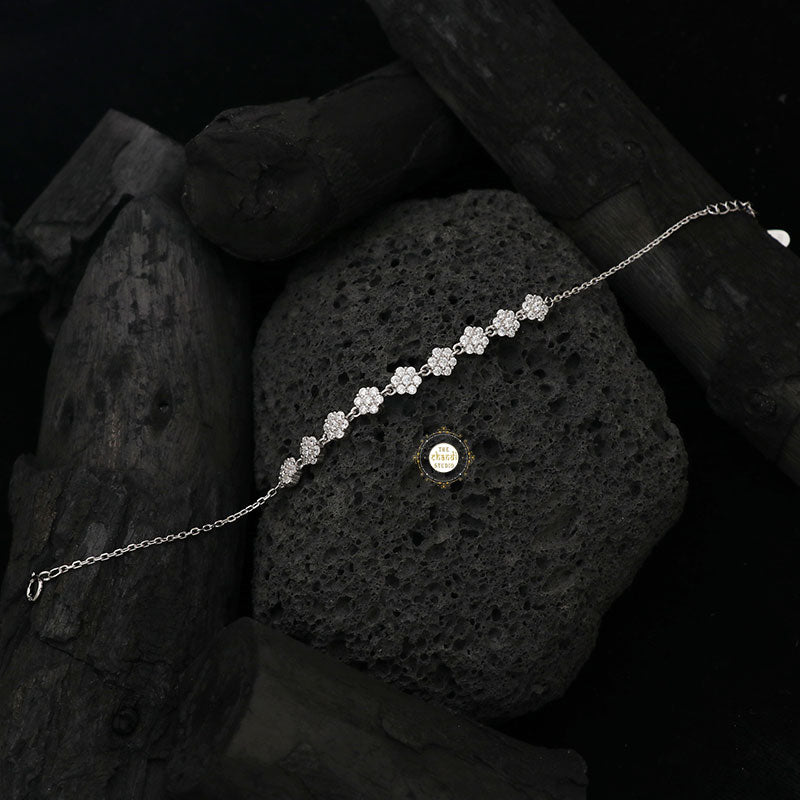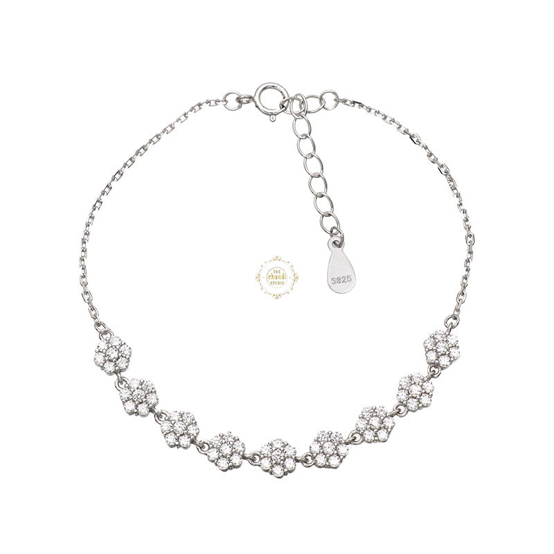 Introducing our Sparkling Silver Classic Flower Bracelet, a timeless beauty from our blingy silver jewellery collection. Adorned with sparkling zircon in a classic flower design, this bracelet radiates elegance and charm. The exquisite craftsmanship and rhodium polish make it a versatile accessory, perfect for adding a touch of sophistication to any outfit. * SIZE ADJUSTABLE * Nickle free Rhodium Polish for better finish