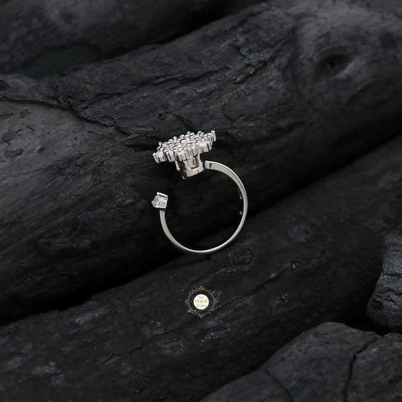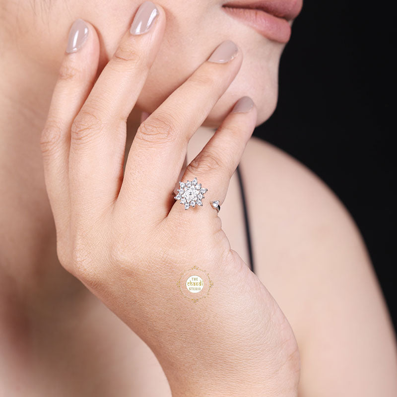 This exquisite ring features a delicate floral motif crafted with precision and adorned with sparkling zircons, adding a touch of glamour and sophistication to any ensemble. * SIZE ADJUSTABLE * Nickle free Rhodium Polish for better finish