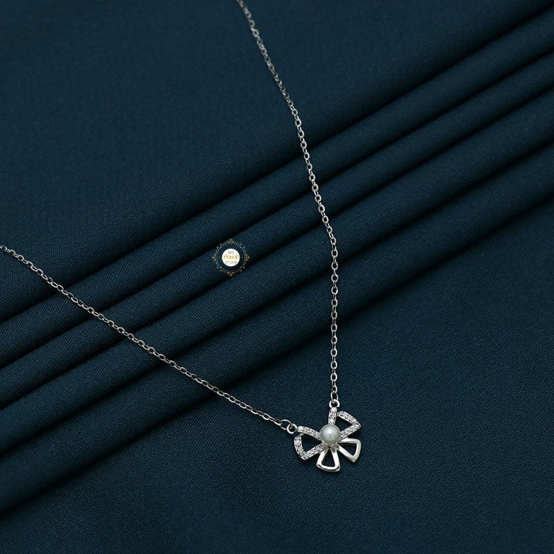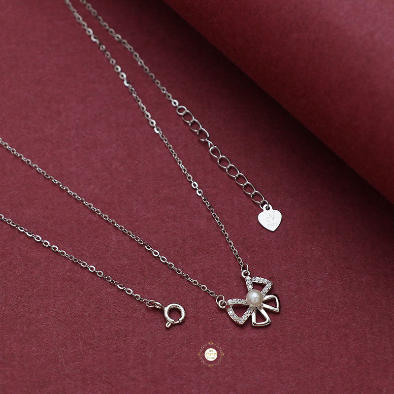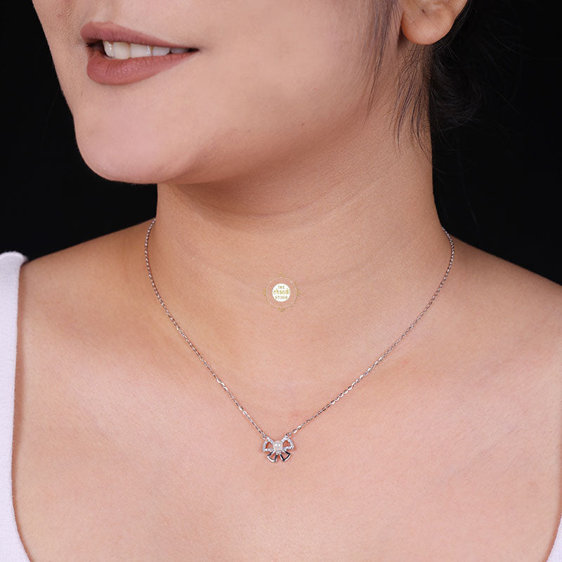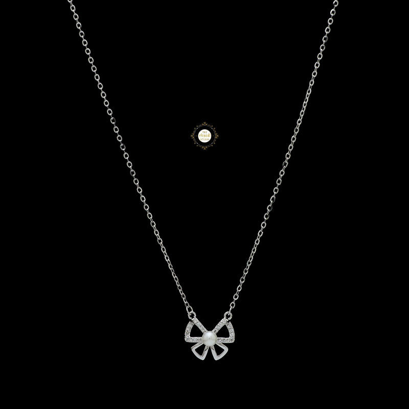 This exquisite necklace features a delicate bow design crafted from sparkling silver, symbolizing grace, femininity, and style. The bow pendant is adorned with shimmering zircon stones, enhancing its creating a captivating sparkle. * Nickle free Rhodium Polish for better finish