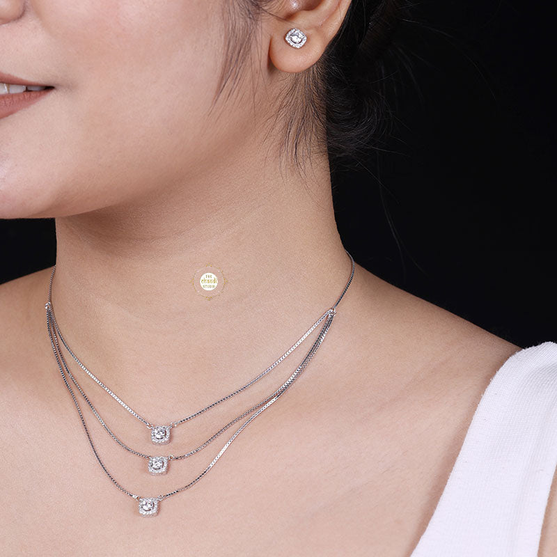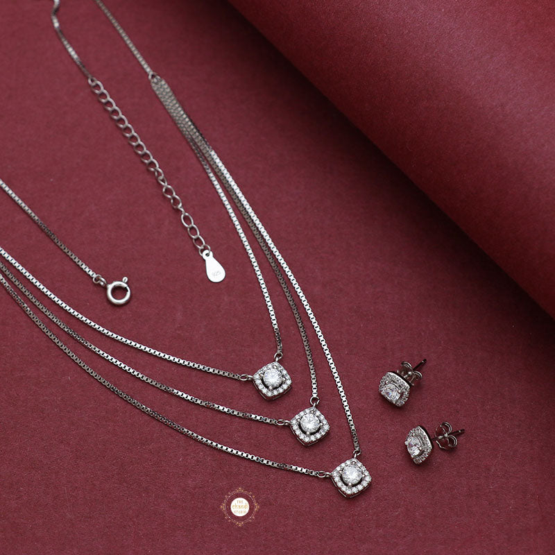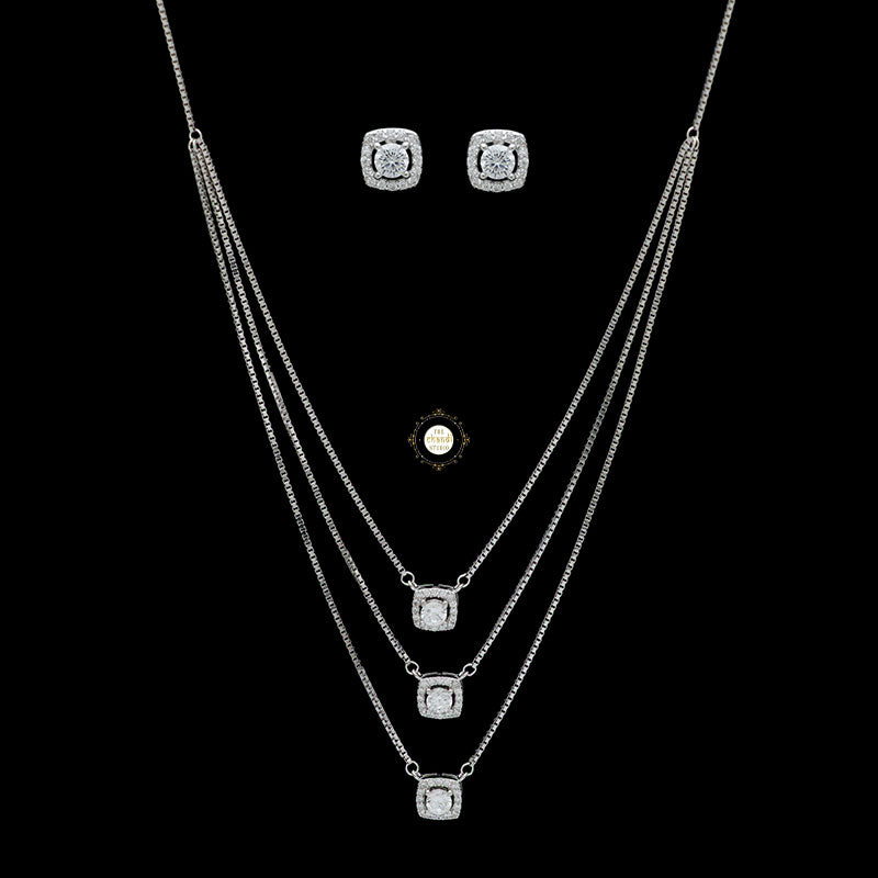 Introducing our exquisite Sparkling Silver Dazzling Layered Necklace with Earrings, a glamorous set that adds a touch of sophistication to any ensemble. This stunning ensemble features a layered necklace design adorned with shimmering zircon stones that sparkle and shine with captivating brilliance, creating a mesmerizing layered effect. * Nickle free Rhodium Polish for better finish