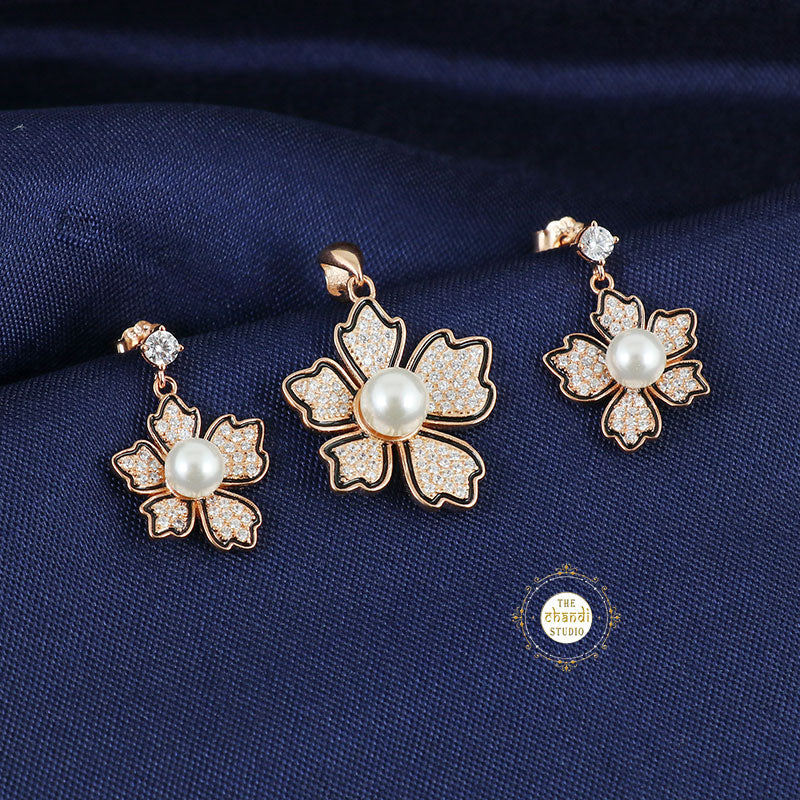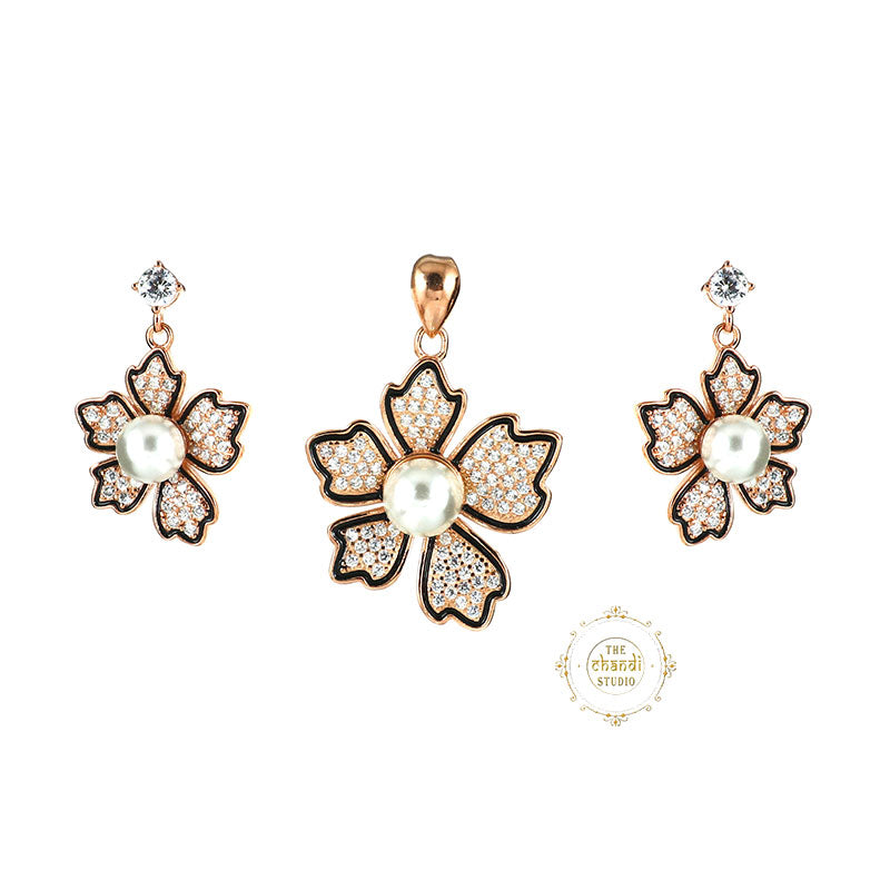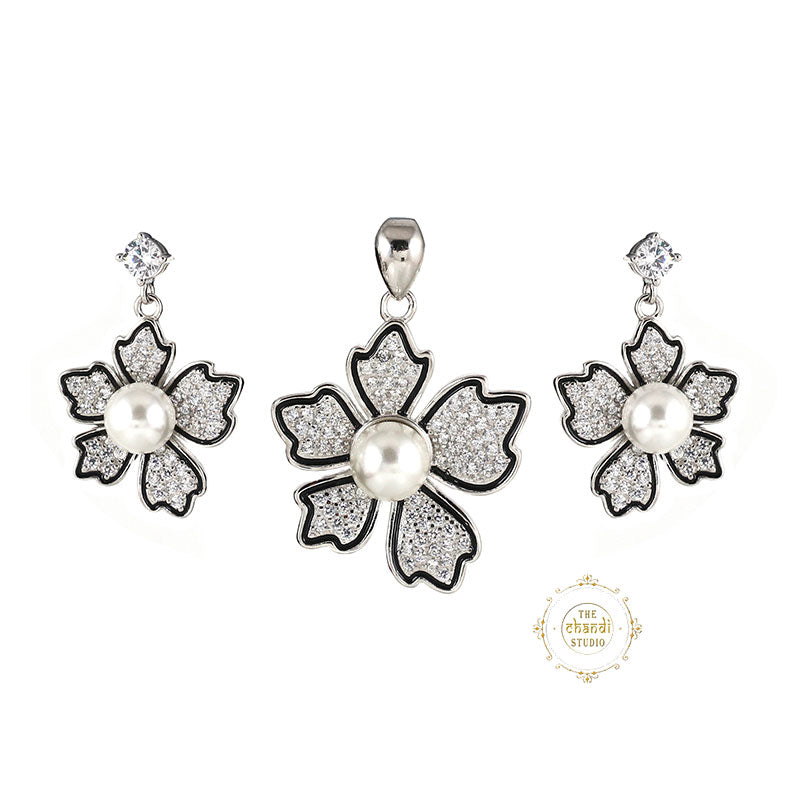 Elevate your elegance with the Sparkling Silver Magnolia Flower Pendent Set Featuring dazzling stones and a timeless design, this silver set adds a touch of luxury to every look.