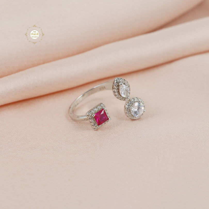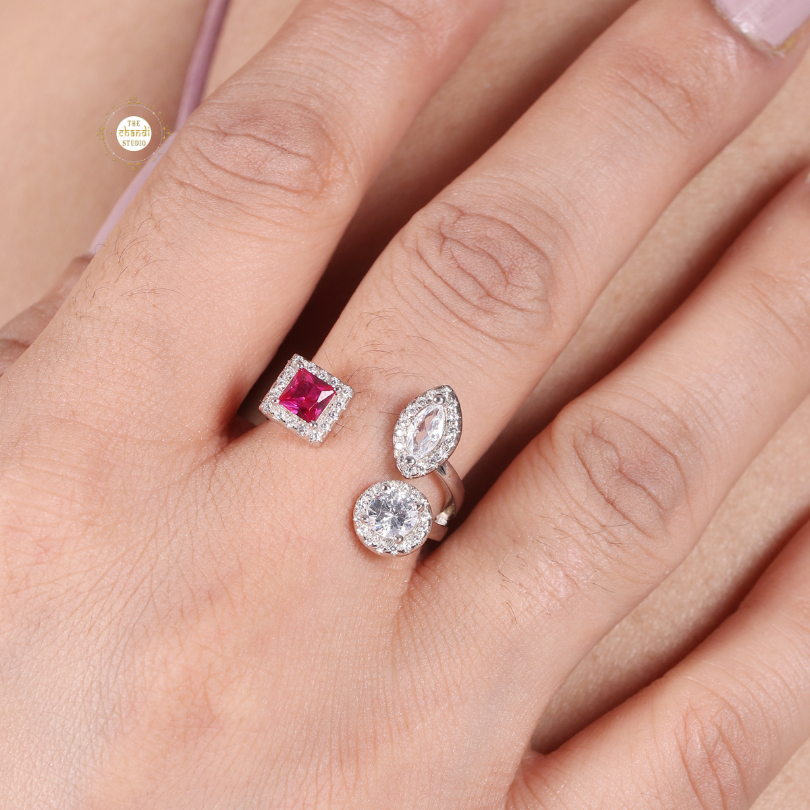 This sterling silver ring is adorned with brilliantly cut sparkling Zircon stones. Manifested on a white toned band, this ring is perfect to solidify a union in love for young adults or women who have just started to work on self-love. SIZE : ADJUSTABLE Nickle free Rhodium Polish for better finish.